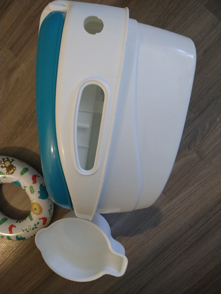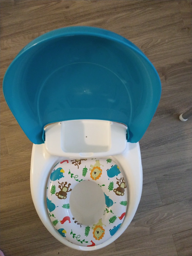 Potty training seat, white and teal. Includes a removable inner potty ring with jungle animal print. Features a lid. Easy to clean.