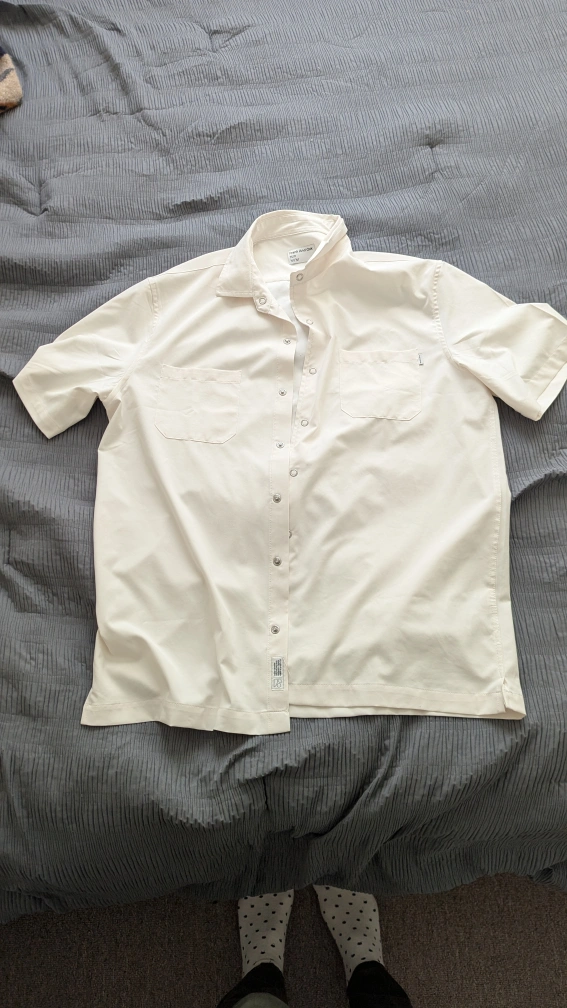 Men's short sleeve button-up shirt. Off-white colour. Size medium. Made in China. 100% polyester. Two chest pockets.