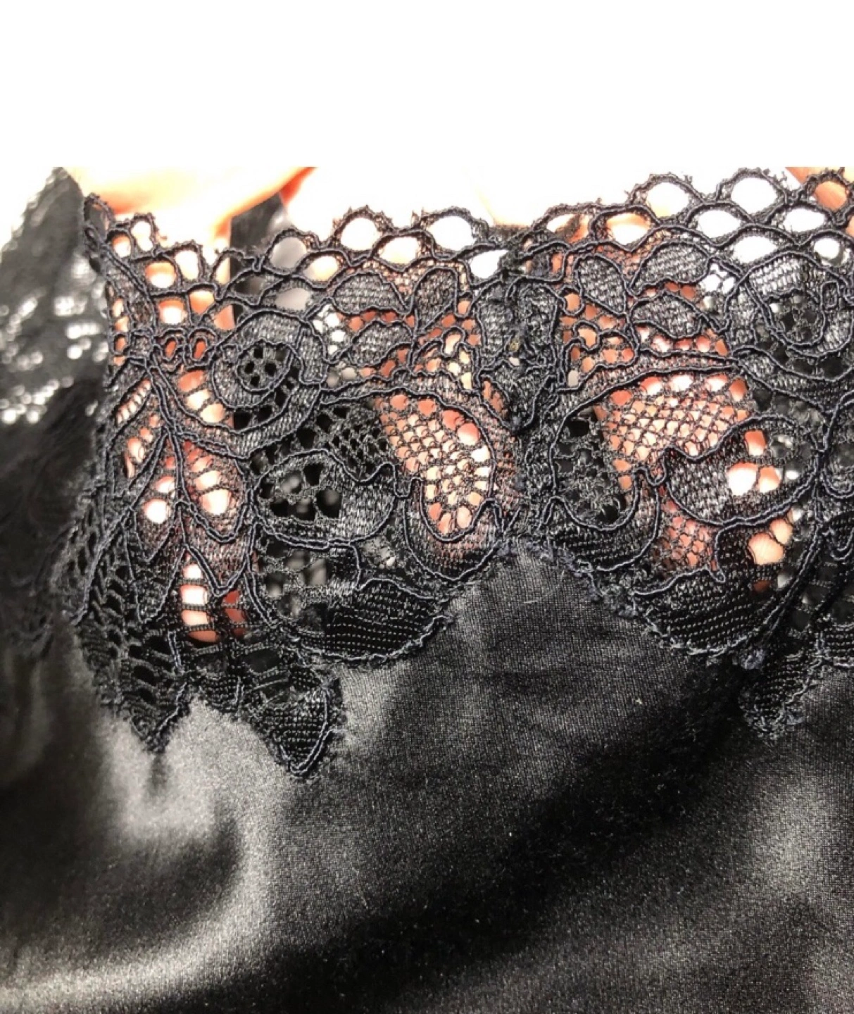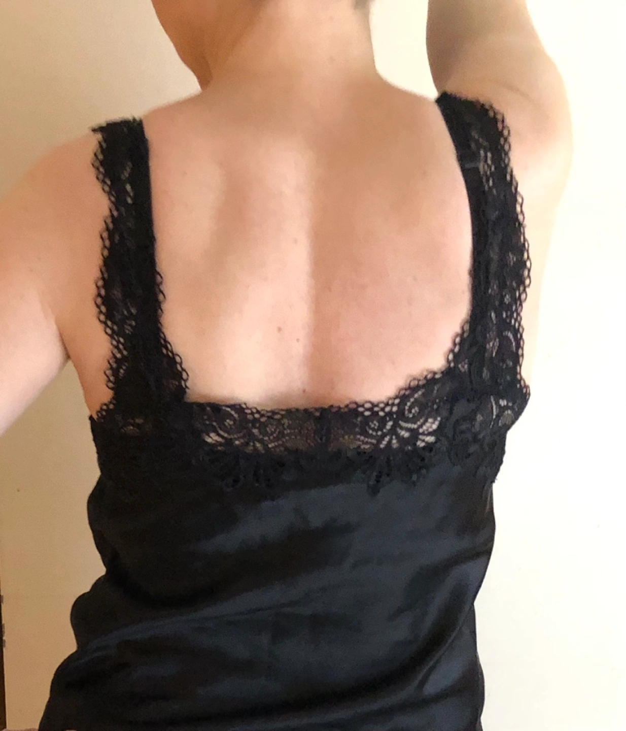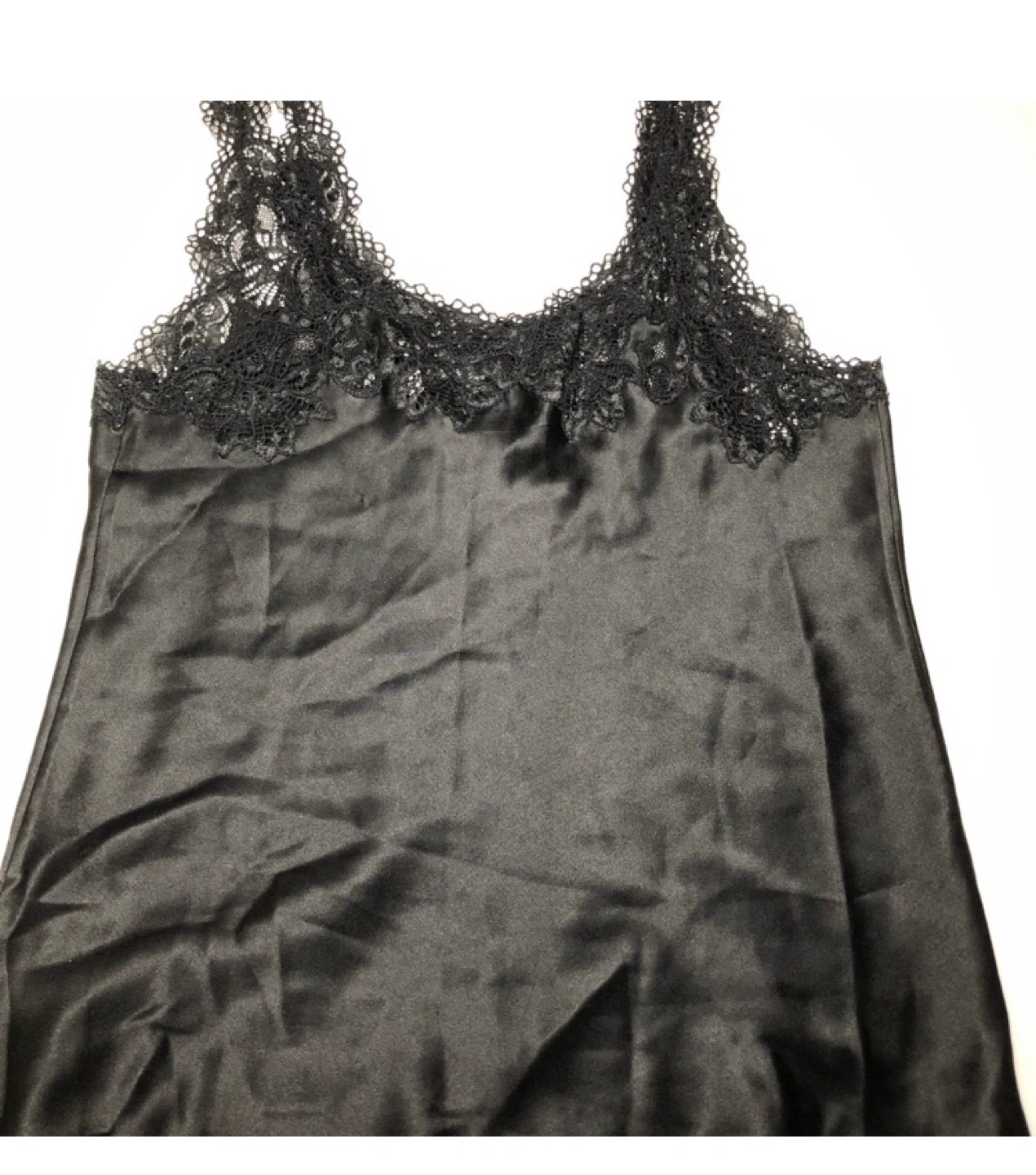 Luxurious black silk Natori camisole with Chantilly lace trim along neckline and straps. XS size but it’s a looser fit so can comfortably fit sizes S/M as well. This top can be worn as a romantic lingerie look, but can work equally well layered for daytime/going out look.