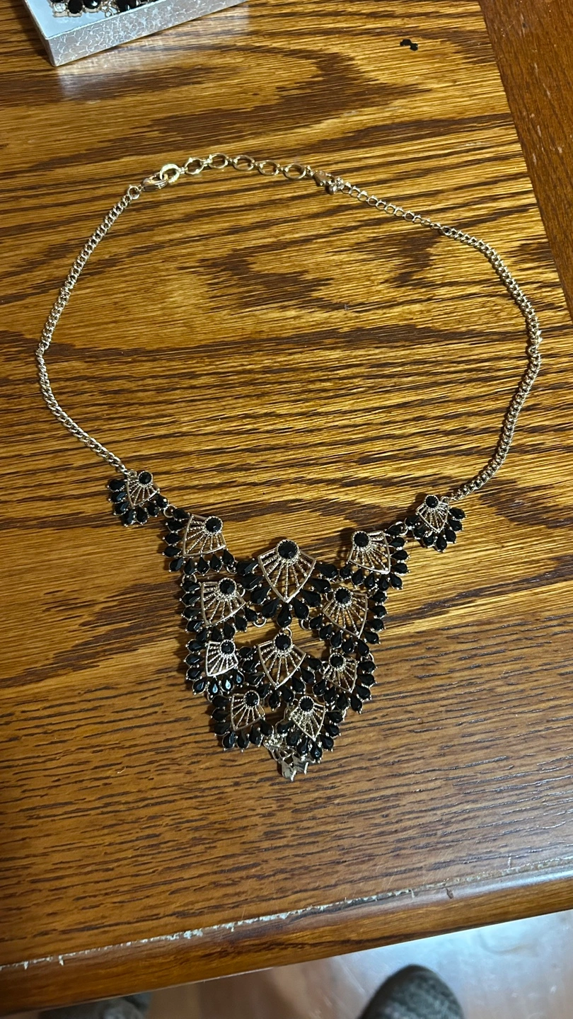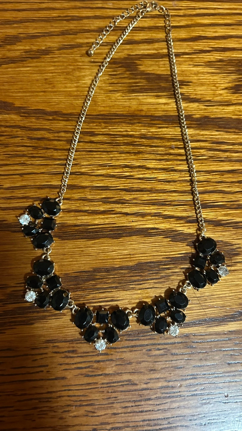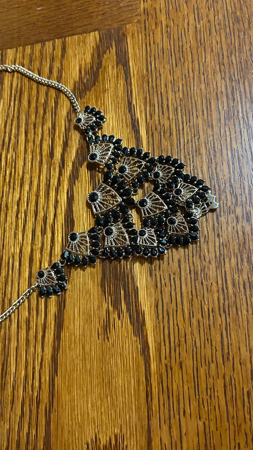 Two beautiful statement necklaces. One features black stones in a gold setting. The other has pastel coloured stones and beads. Both have gold chains. 5$ each. Can send me offer if take whole