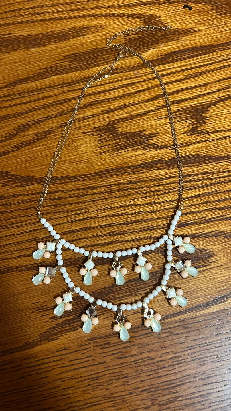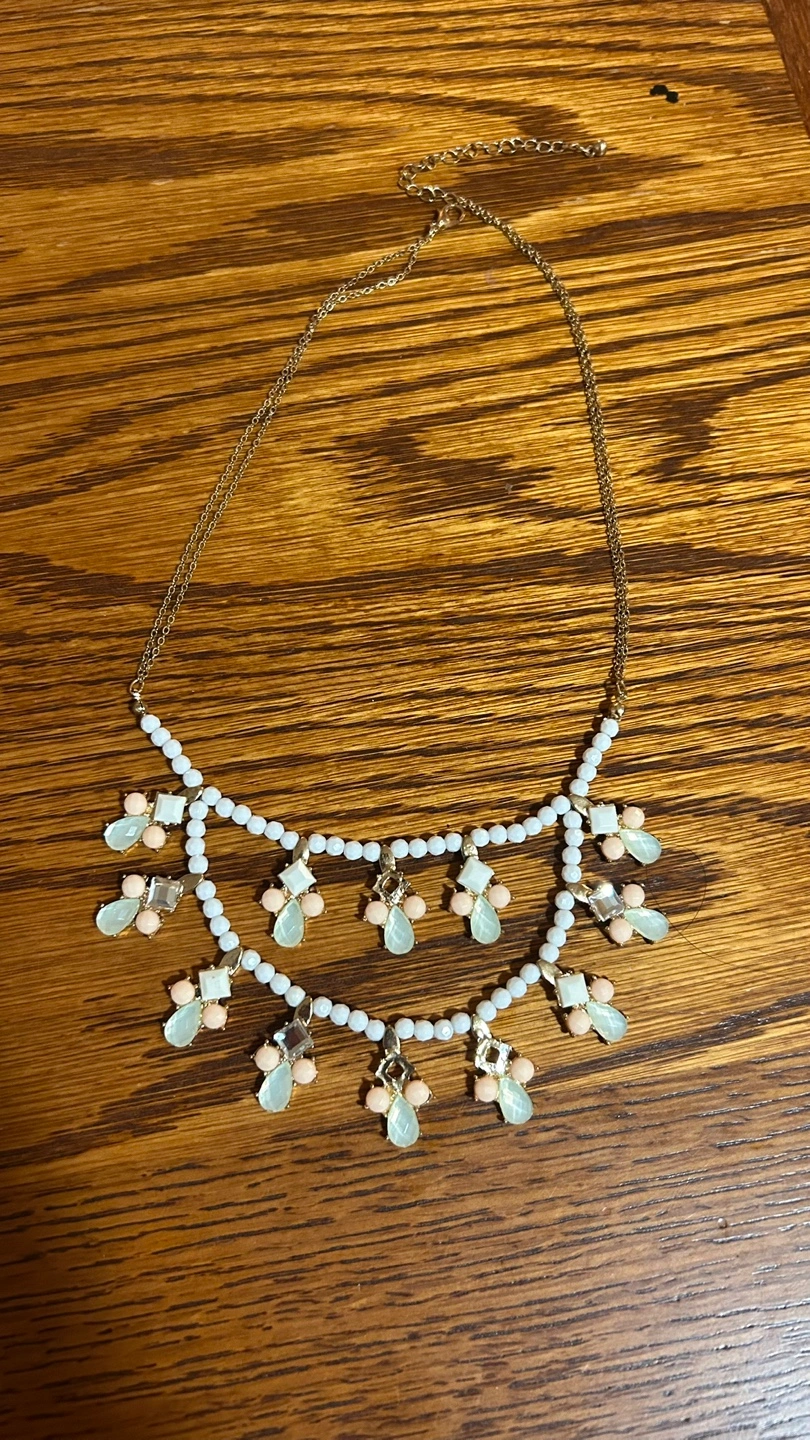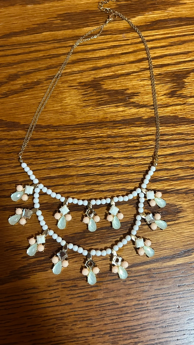 Two beautiful statement necklaces. One features black stones in a gold setting. The other has pastel coloured stones and beads. Both have gold chains. 5$ each. Can send me offer if take whole