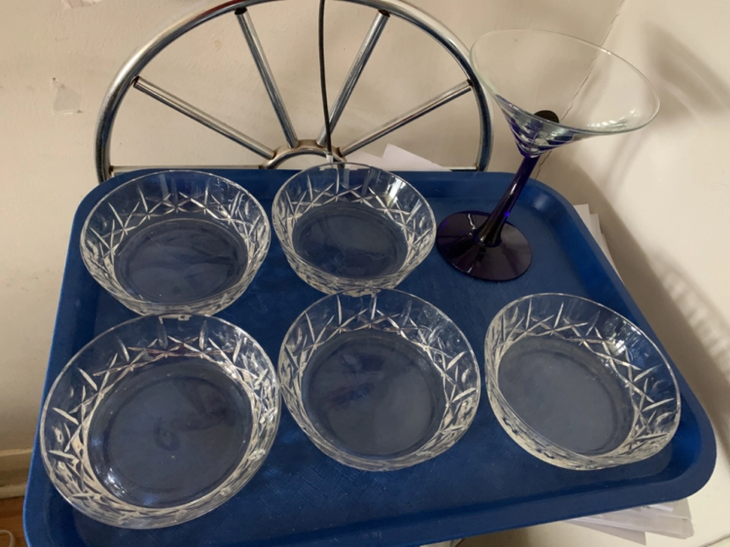 Five lovely crystal dessert bowls. Cut glass pattern. Includes a stemmed martini glass.