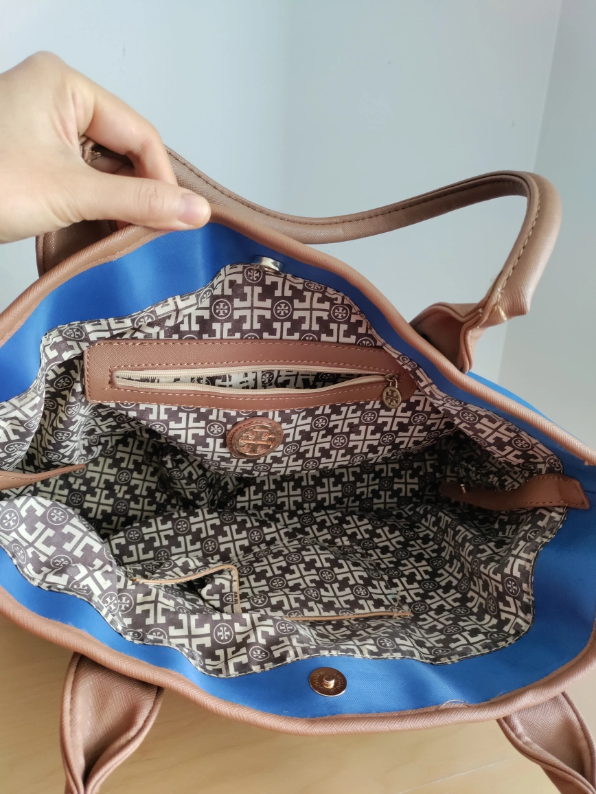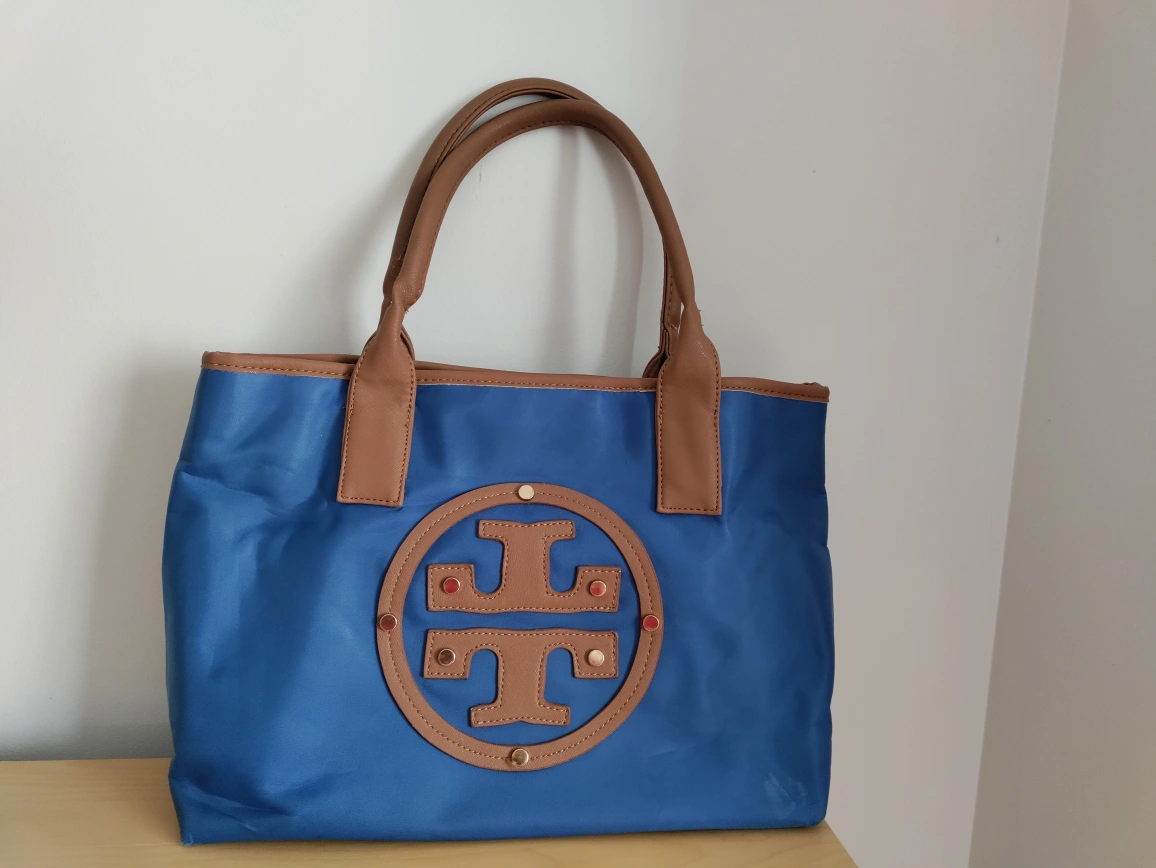 Beautiful blue tote bag. Tan leather handles and accents. Interior features a small zippered pocket and Tory Burch logo print lining. Great everyday bag.