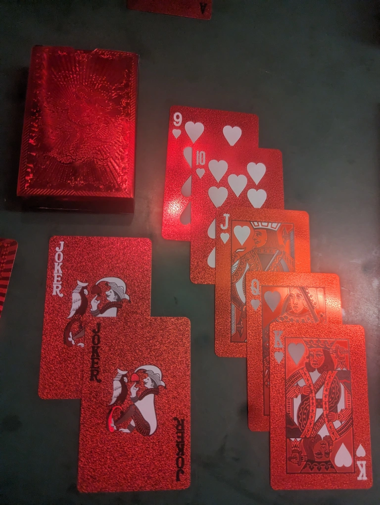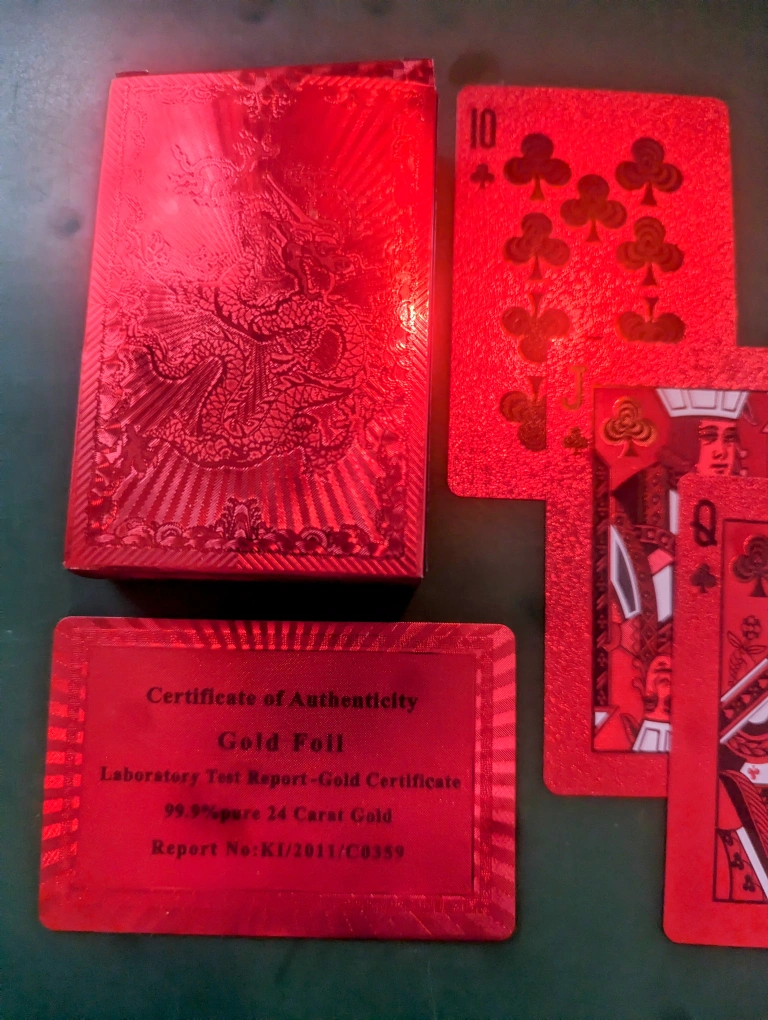 54 Red Dragon Red Red playing cards. Gold foil detailing. Includes certificate of authenticity. 99.9% pure 24-carat gold. Waterproof. ++++ Plus diamond suited flush poker ring ++++. Stainless Steel 3 mm. Expands and fits most sizes. Please check out my other listings.