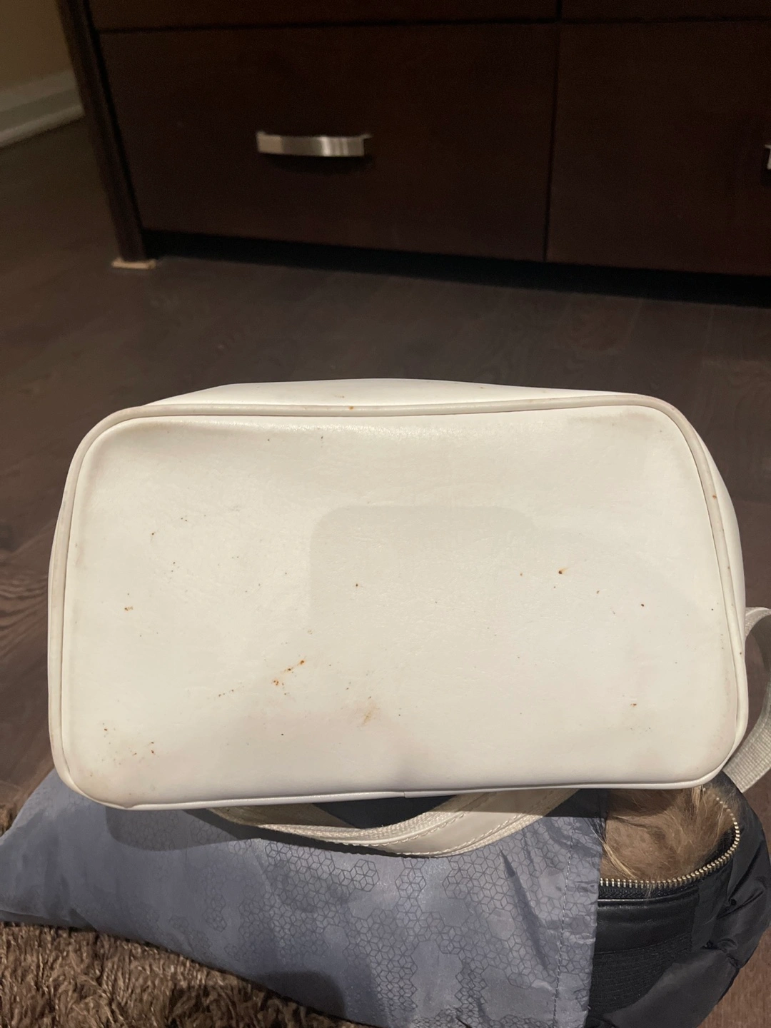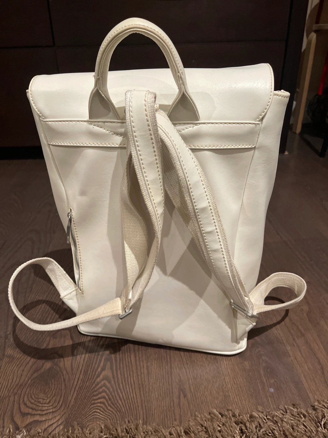It’s a preowned Matt and nat white vegan backpack.it has few stains especially at the bottom.but no tears.