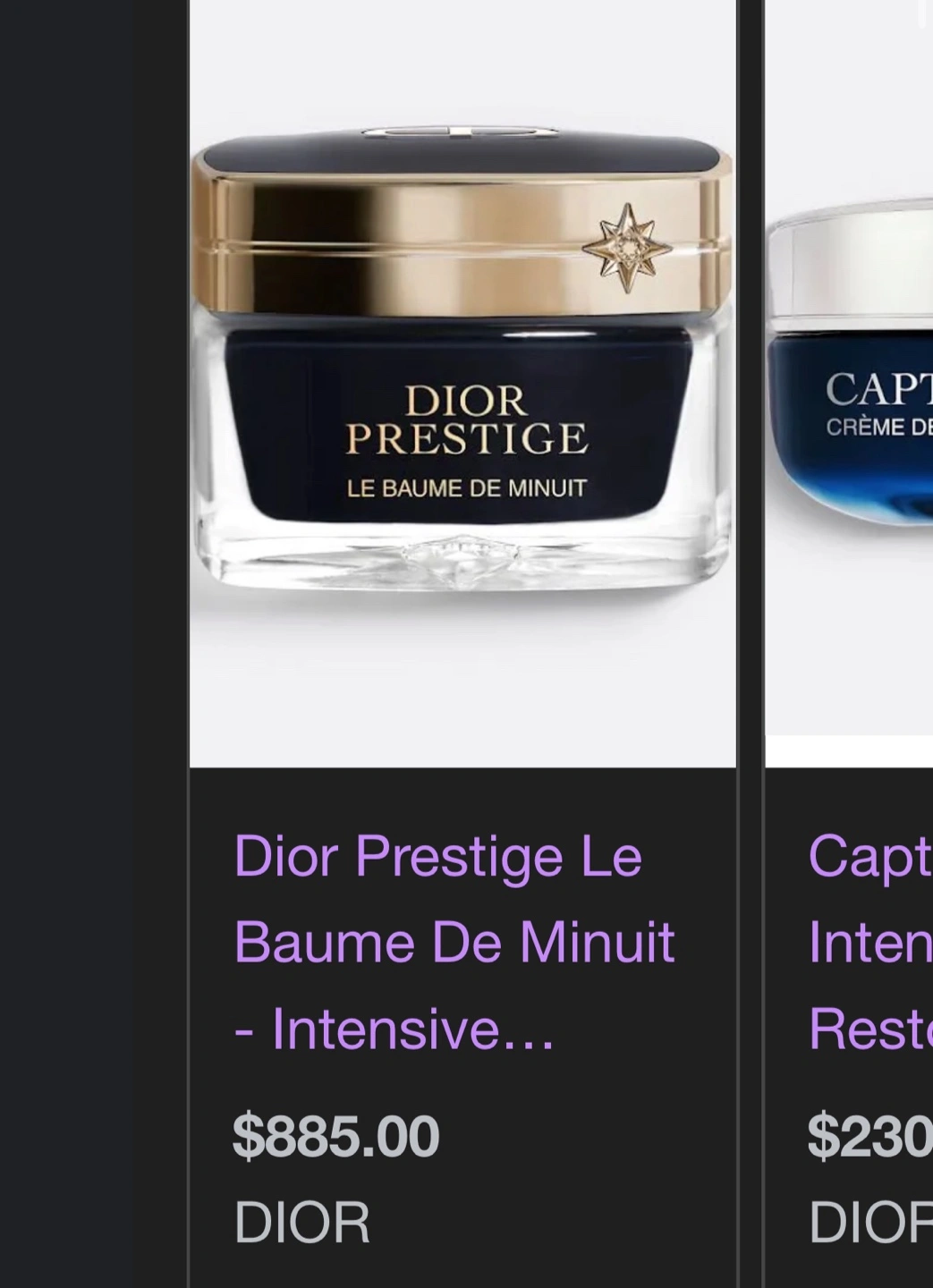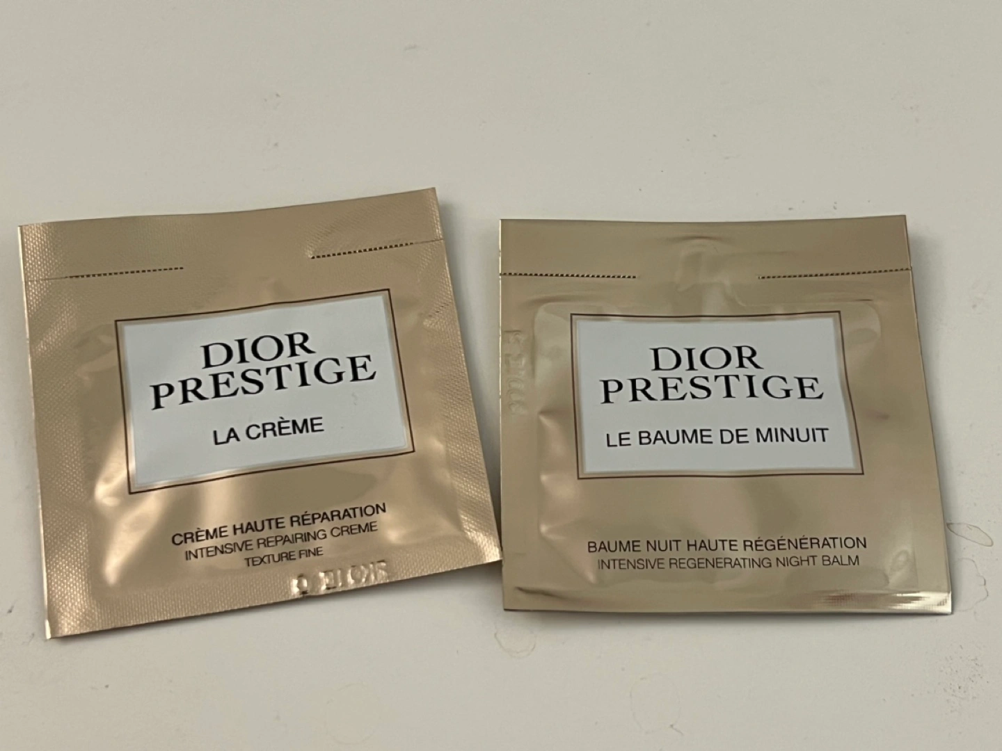 Two sample sachets of Dior Prestige skincare. Intensive repairing cream and intensive regenerating night balm. $20/ ml on Dior official website