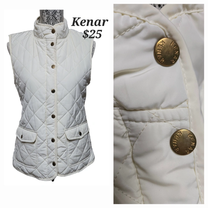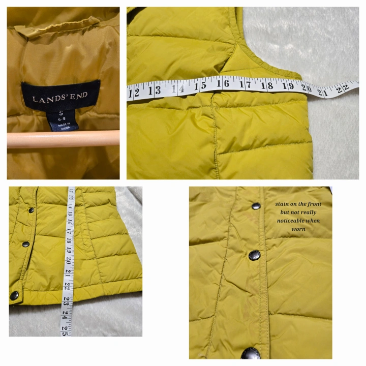 Kenar vest white vest has a very tiny mark, as shown in the photo. Lands' End mustard vest has some staining on the front, as shown on the photo, but barely noticeable when worn. This is an oversized small so fits perfectly with medium size. The rest are in good condition. Location Barrhaven area close to Home Depot. Cash on pick up rE transfer few minutes prior to pick up. NO, by the door transfer. Please see other listings.Show less
