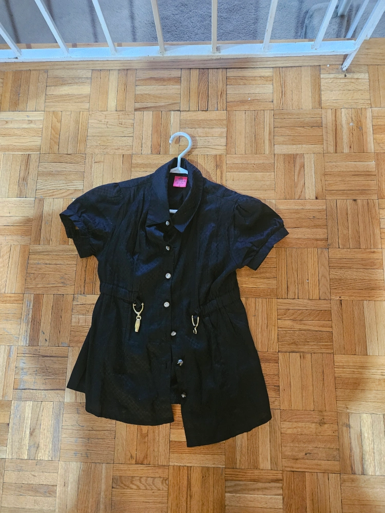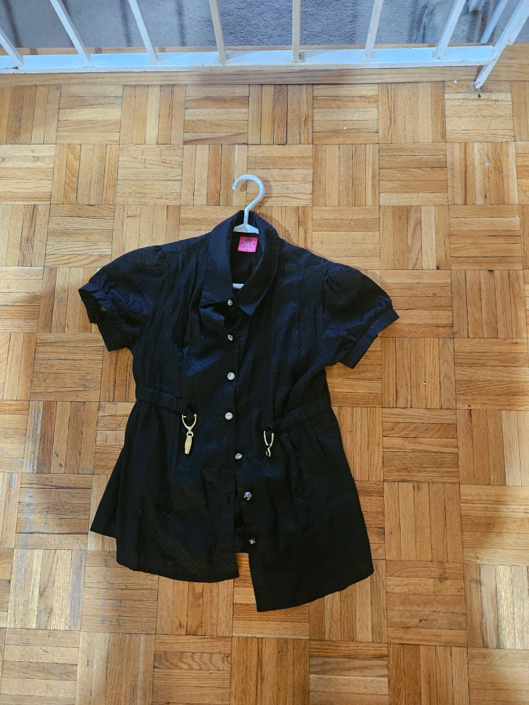 Women's short-sleeve black button-down blouse. Features gold accents and a slightly A-line silhouette. Casual style, perfect for spring or summer.