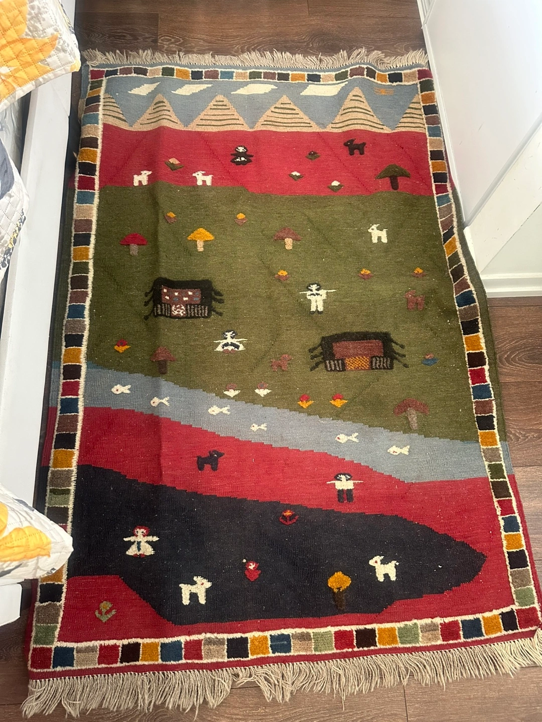 Colorful handwoven rug. Measures approximately 150 x 104 cm. Wool material. Unique design.