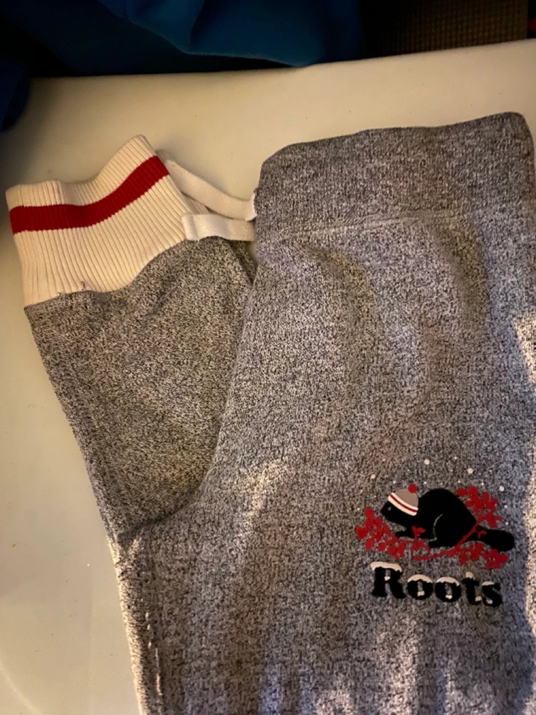 Cozy grey joggers. Features a festive beaver design and ribbed cuffs. Drawstring waistband.
