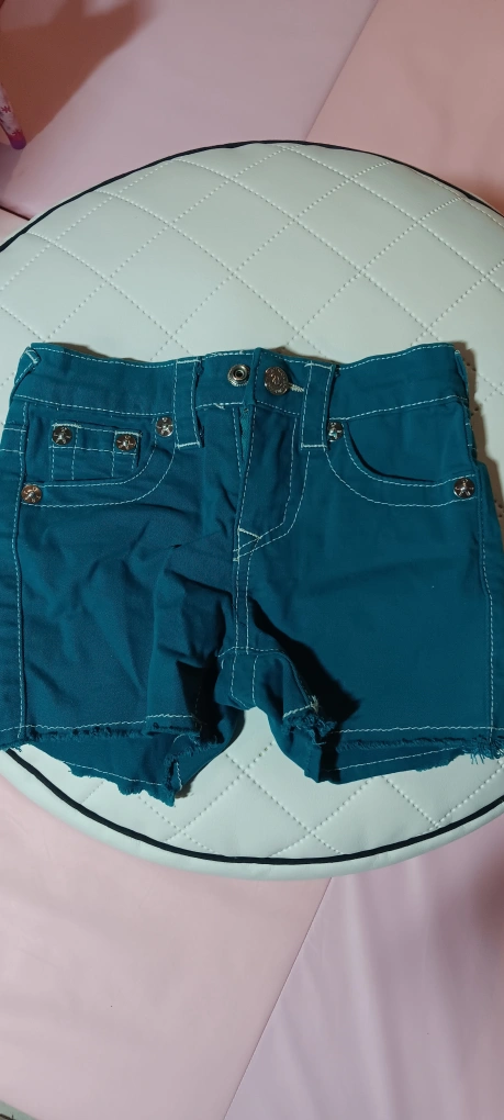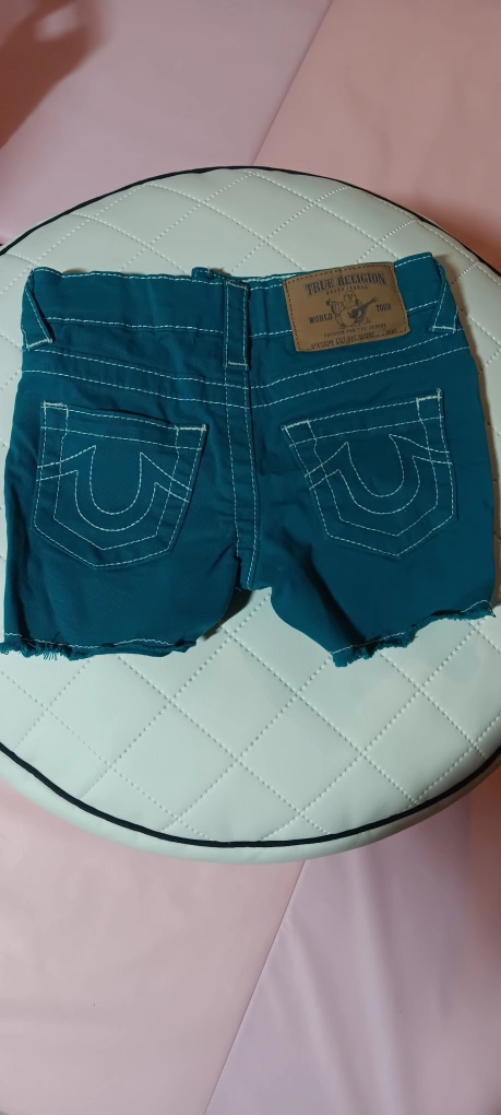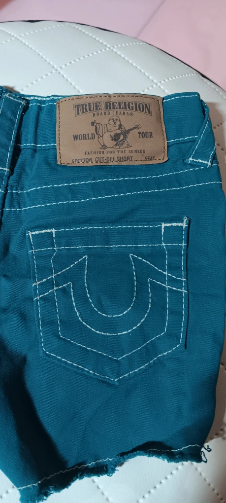 Teal colour True Religion brand shorts. Size 4. Cut-off style. World Tour design.