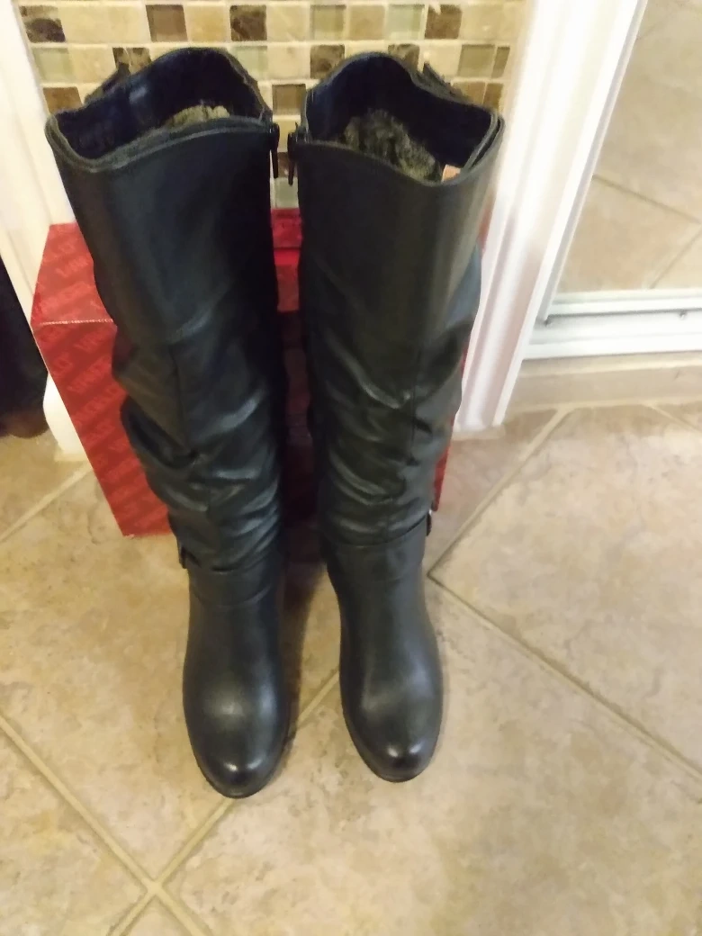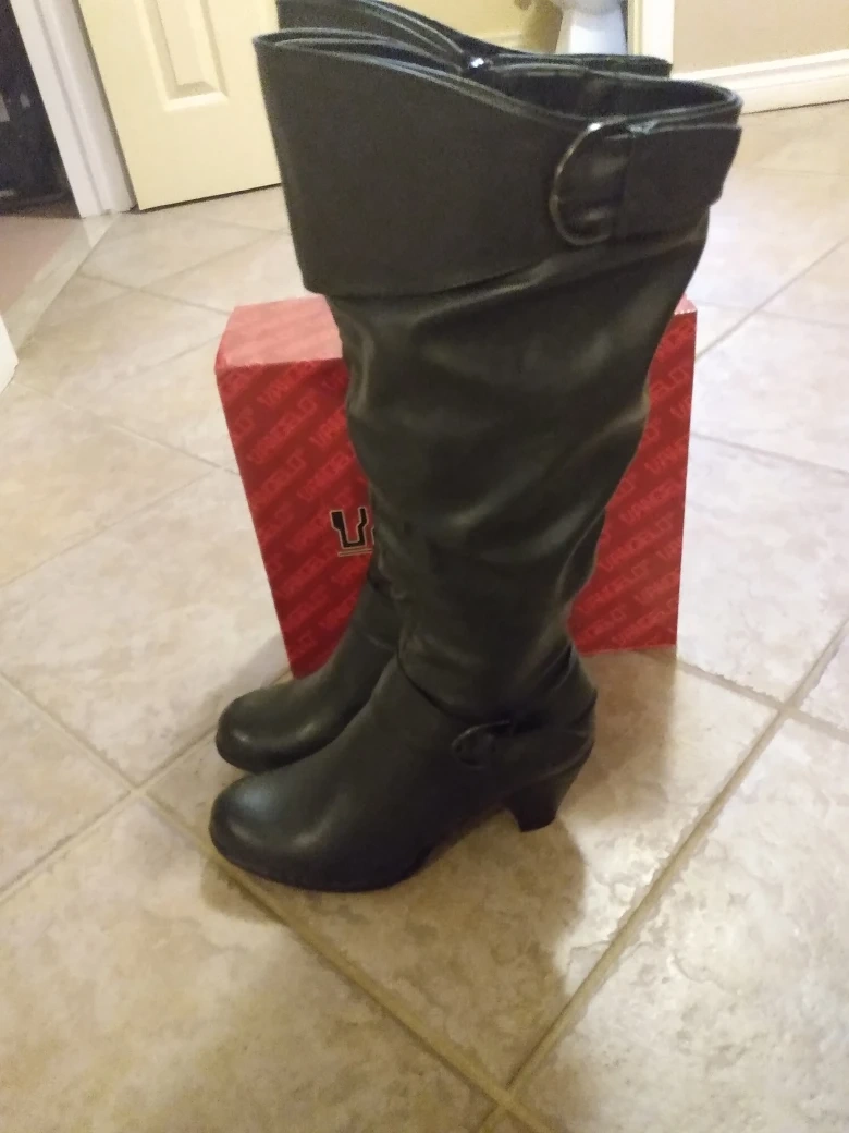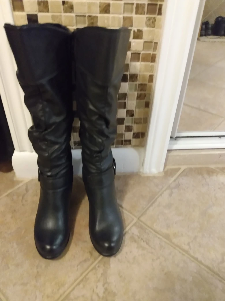 Pair of black leather women's slouch boots. Knee-high, Buckle detail. side zipper and buckle, 2 inched wedge heels π looks beautiful with any dresses or trousers