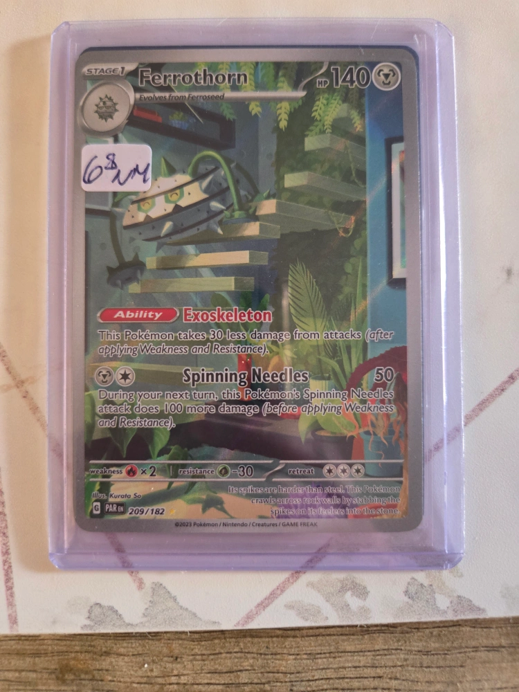 Pokemon trading card featuring Ferrothorn. Stage 1 evolution. HP 140. Includes Exoskeleton ability and Spinning Needles attack.