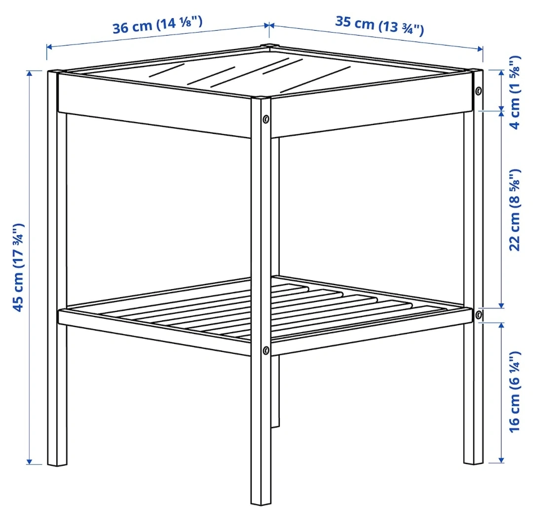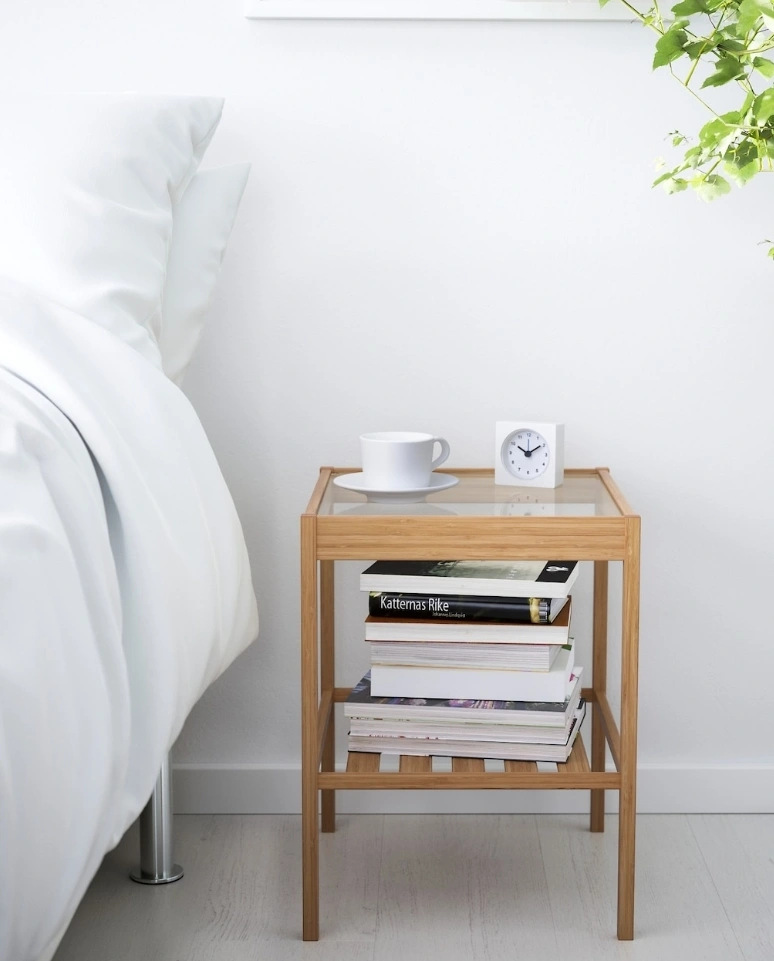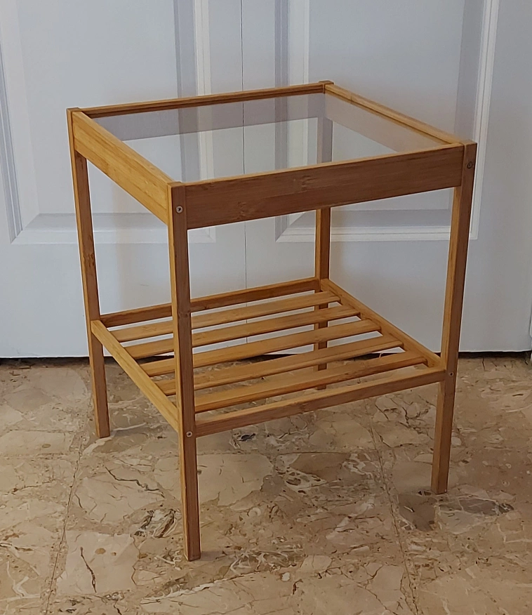 Small Ikea Nesna bamboo side table. Glass top. Lower shelf. Good condition. Perfect bedside table. Please refer to images for the dimensions. If ad is here it is available. Don't ask. Pick up only Pet free and smoke free household Yonge and Eglinton area Only cash payment