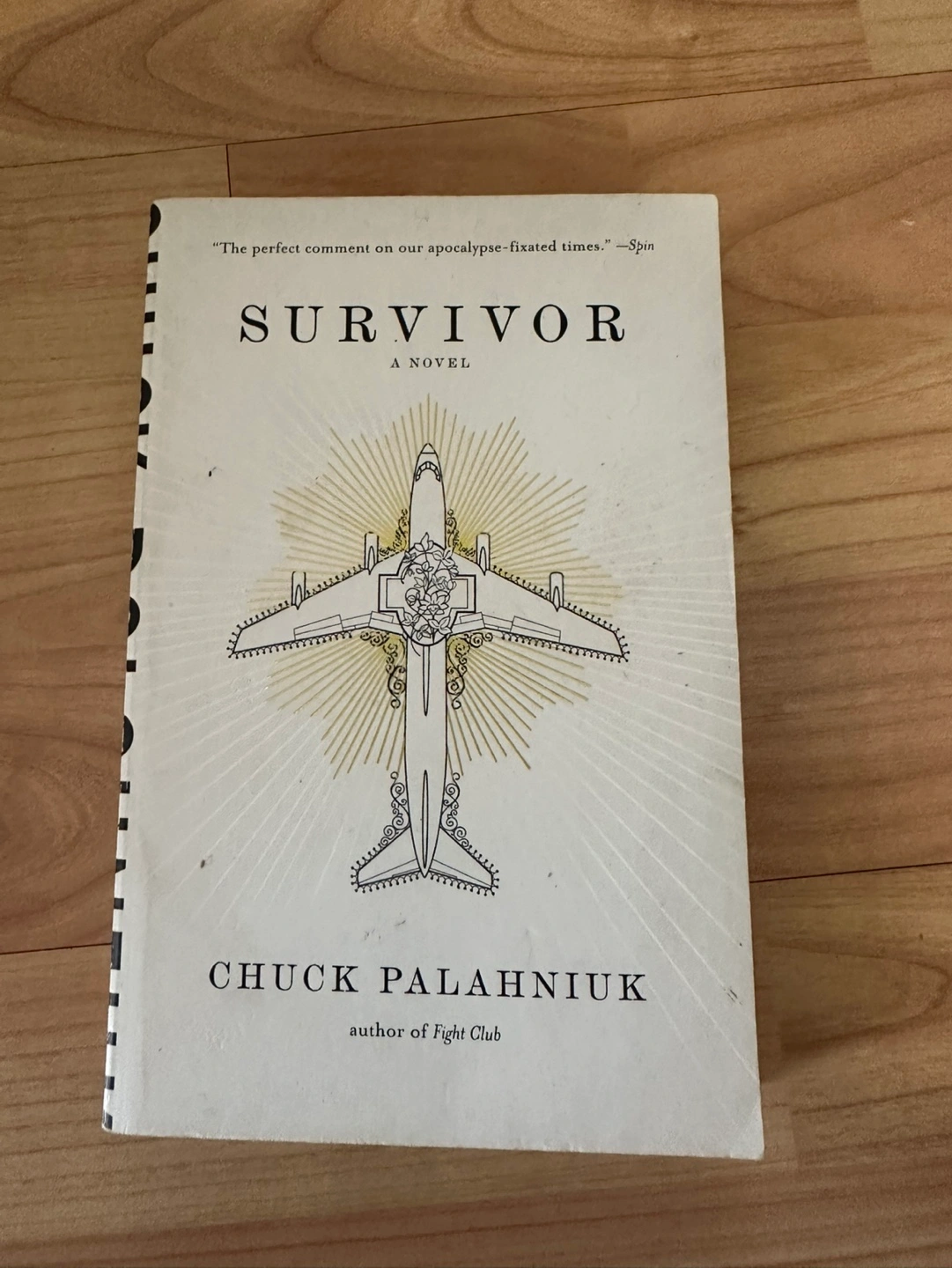 Paperback book. Author of Fight Club. Features airplane imagery on cover. Pick up at Bay & College