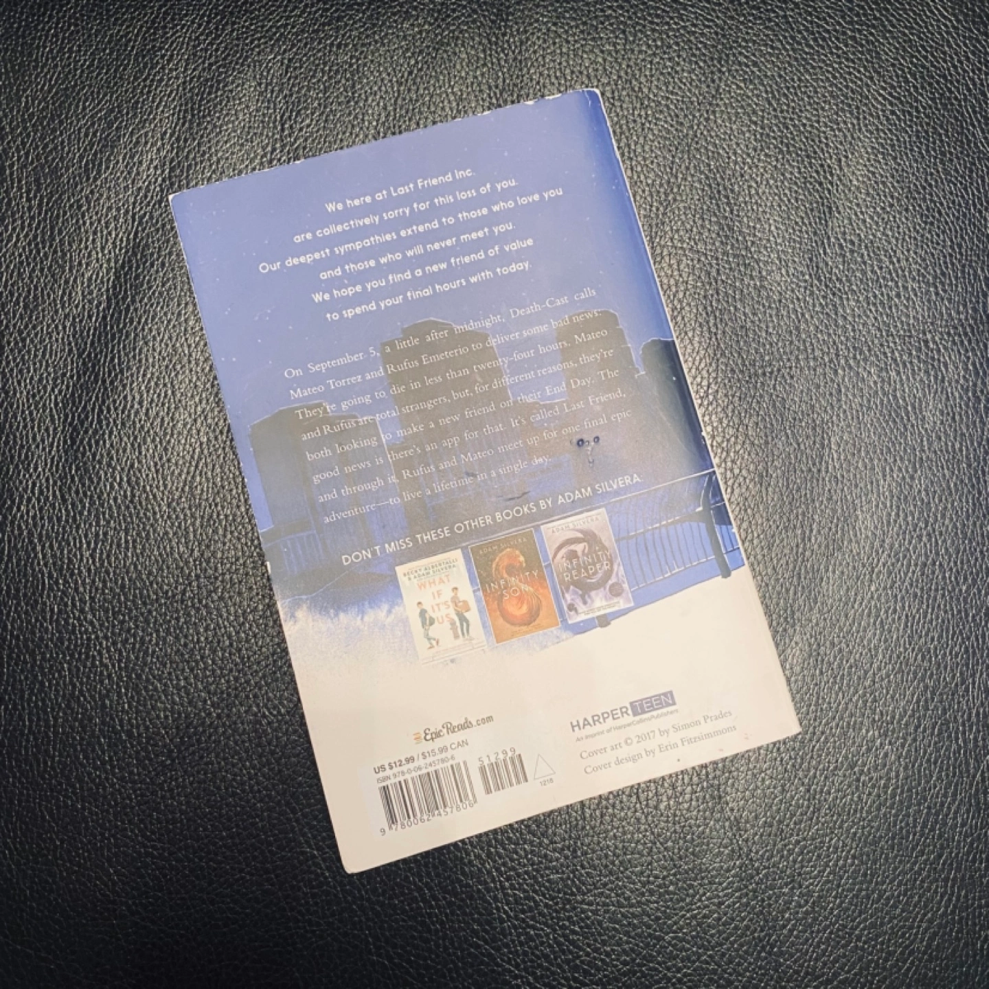 Paperback copy of They Both Die at the End. New York Times bestseller. Includes a sneak peek at Infinity Son. Great condition. Excellent book about mortality and living life to the fullest. #dystopian #teen #YA #fiction #lgbqt #queer #death #technology #freecycle