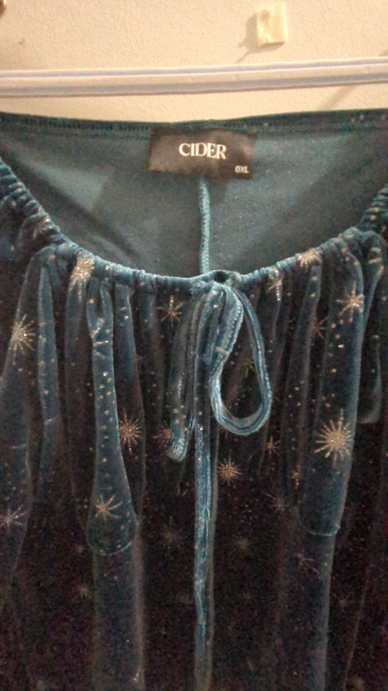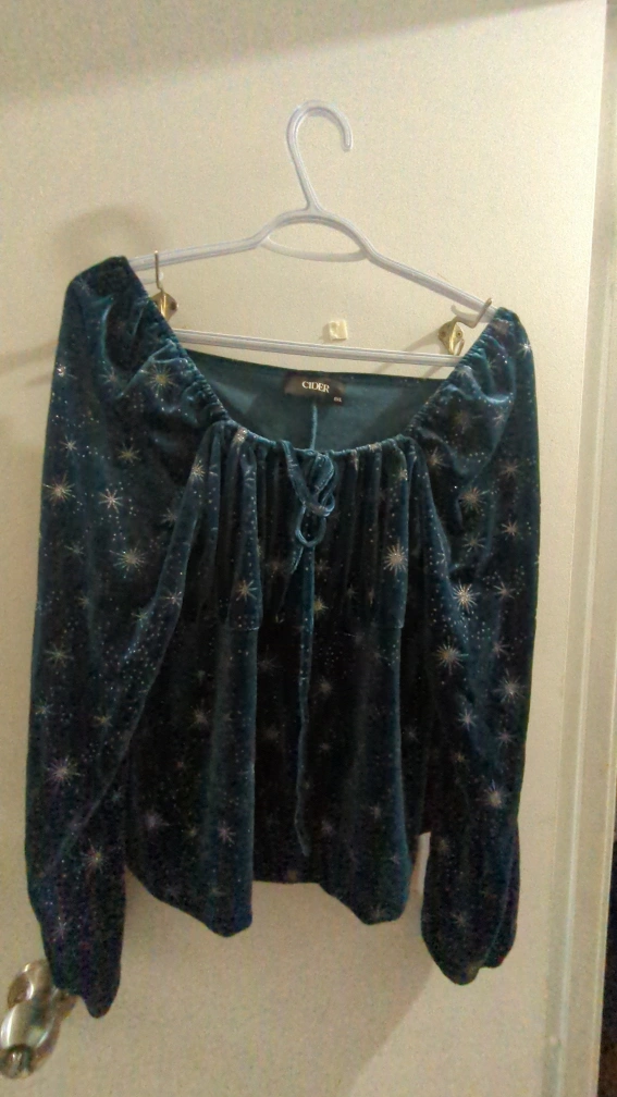 Beautiful teal velvet blouse. Features long sleeves, a drawstring neckline, and a star pattern. Size XL. Washed, never used. Pick up options: - Jane and Eglinton or - Dovercourt and Dundas West (Monday to Friday 8am to 1pm)
