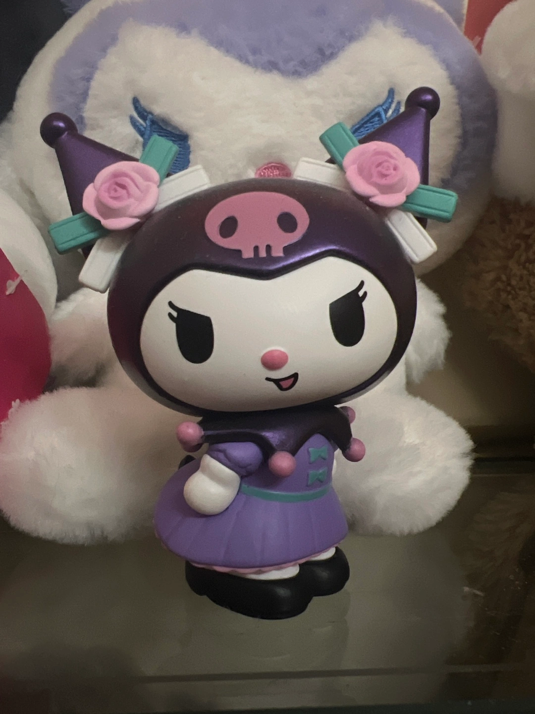 Collectible Kuromi figurine. Purple dress, skull detail. Small size, perfect for collectors.