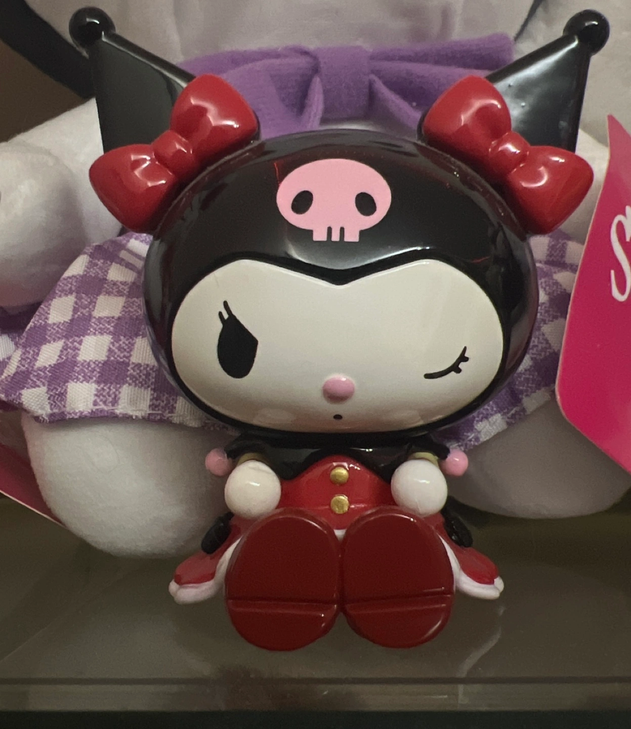 Cute Kuromi figurine. Collectible item. Red dress, black hair, skull detail. Great for fans.