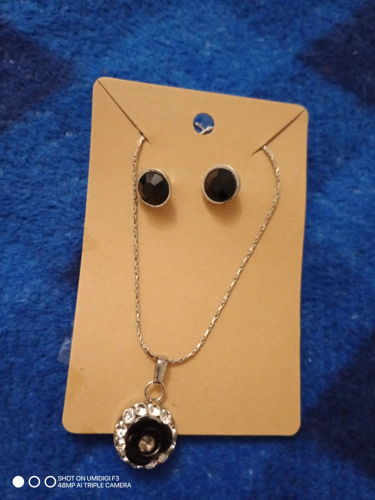 Elegant necklace and earring set. Features a delicate silver chain, black stone earrings, and a pendant with a black flower design accented with clear stones.was $20.00 .Now on sale