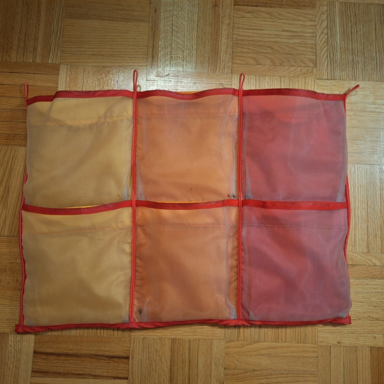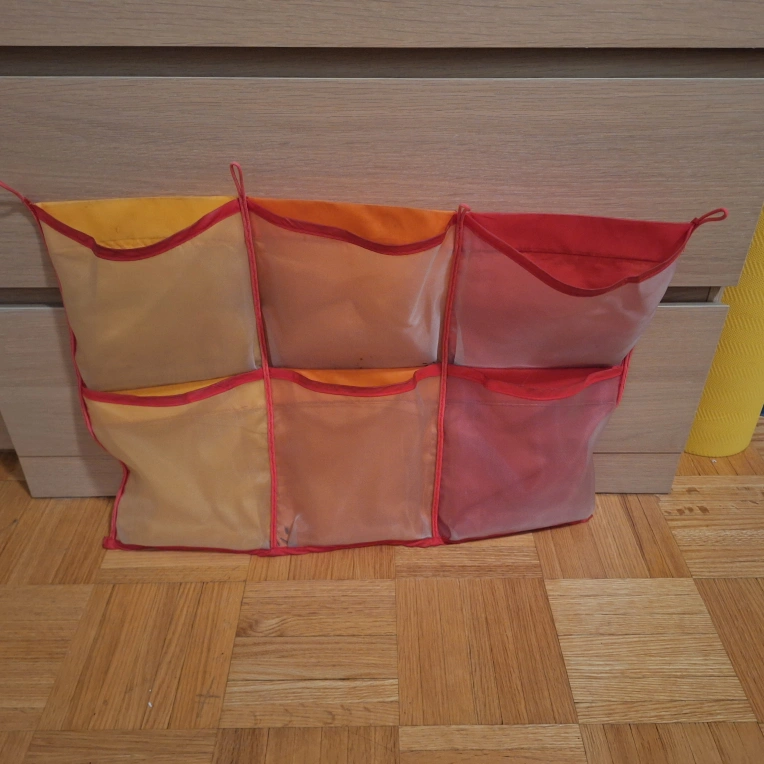 This item is discontinued at IKEA. 6 pockets to hold all those small toys. Hangs easily. Just needs to be half washed. I have a 2nd one if you can use 2 of them. Perfect to hold those small toys, in a bedroom or play area.