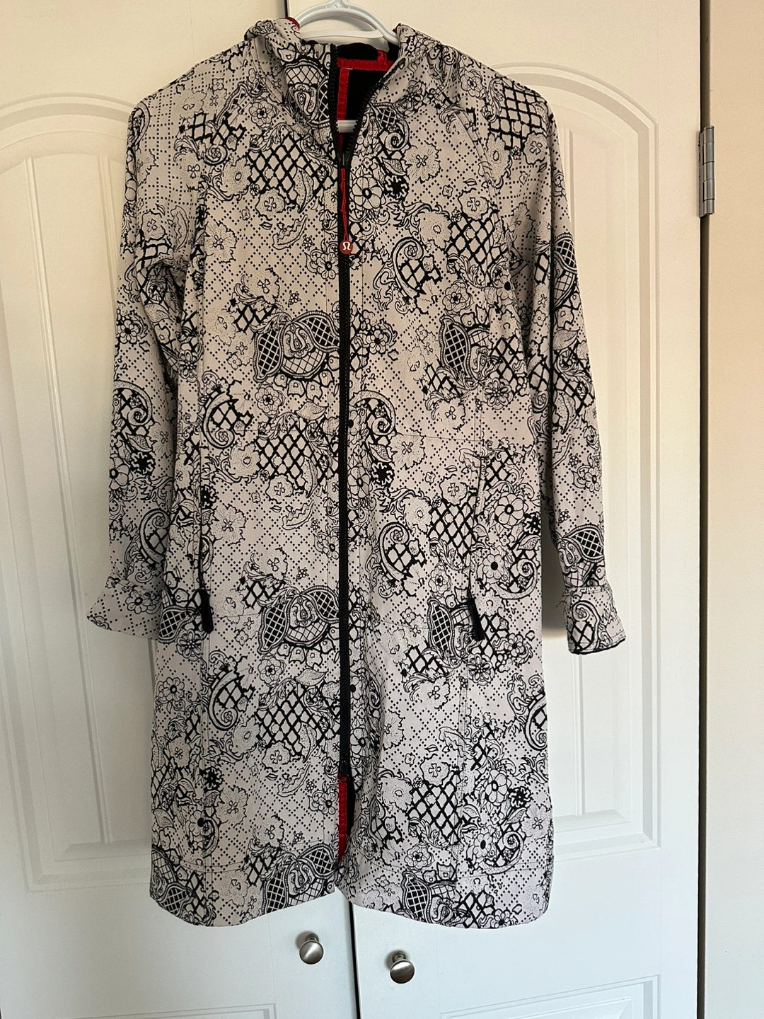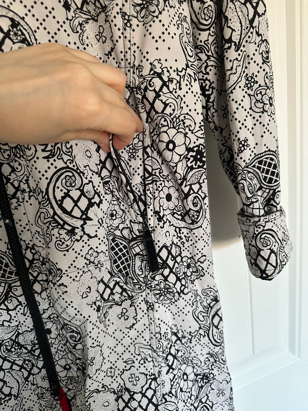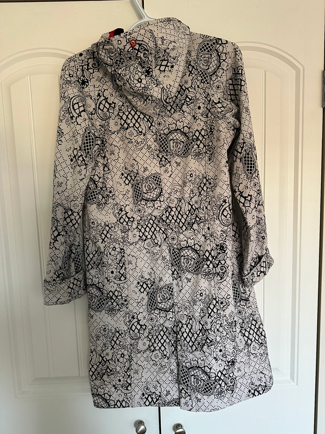 Black and white floral print. Long sleeves. Full zip closure. Excellent condition. It is knee-length and has been very lightly used. The fleece-lined interior makes it perfect for spring and fall, keeping warmth inside.No defects, in excellent condition.