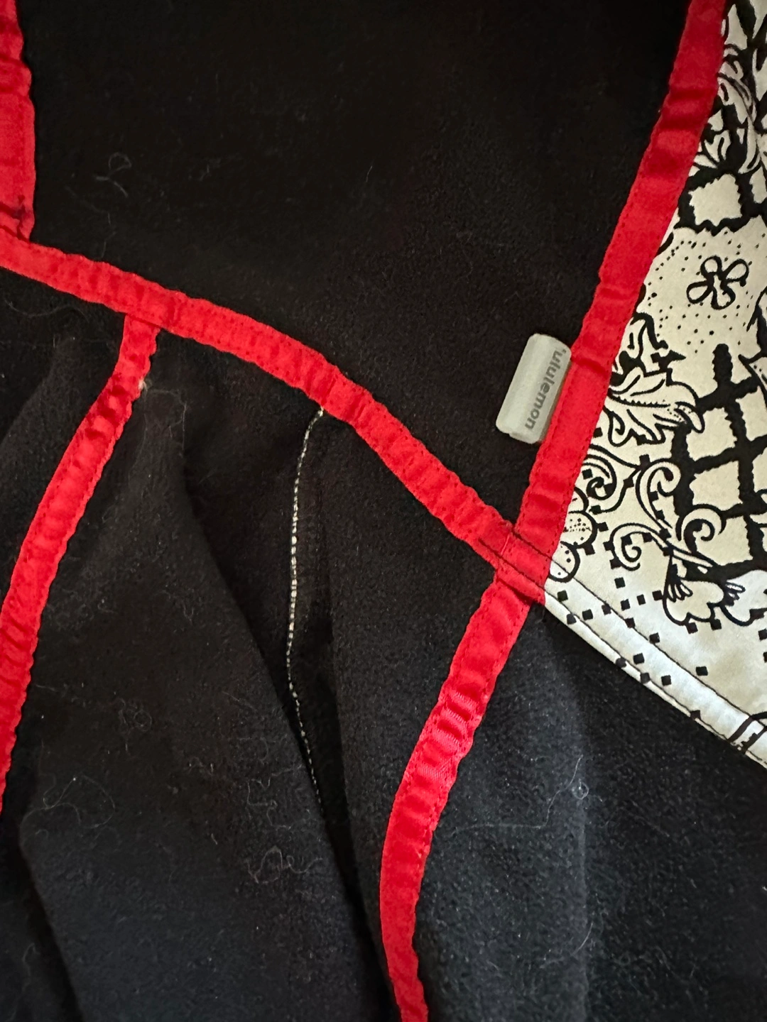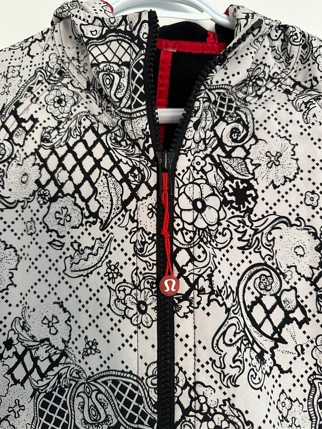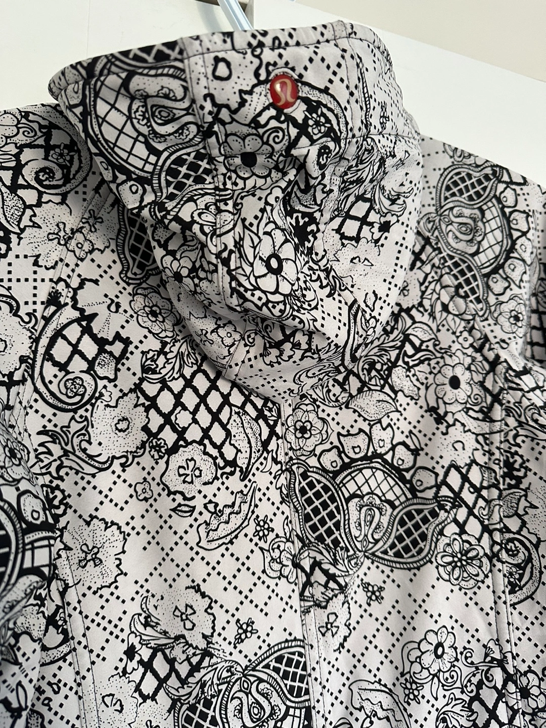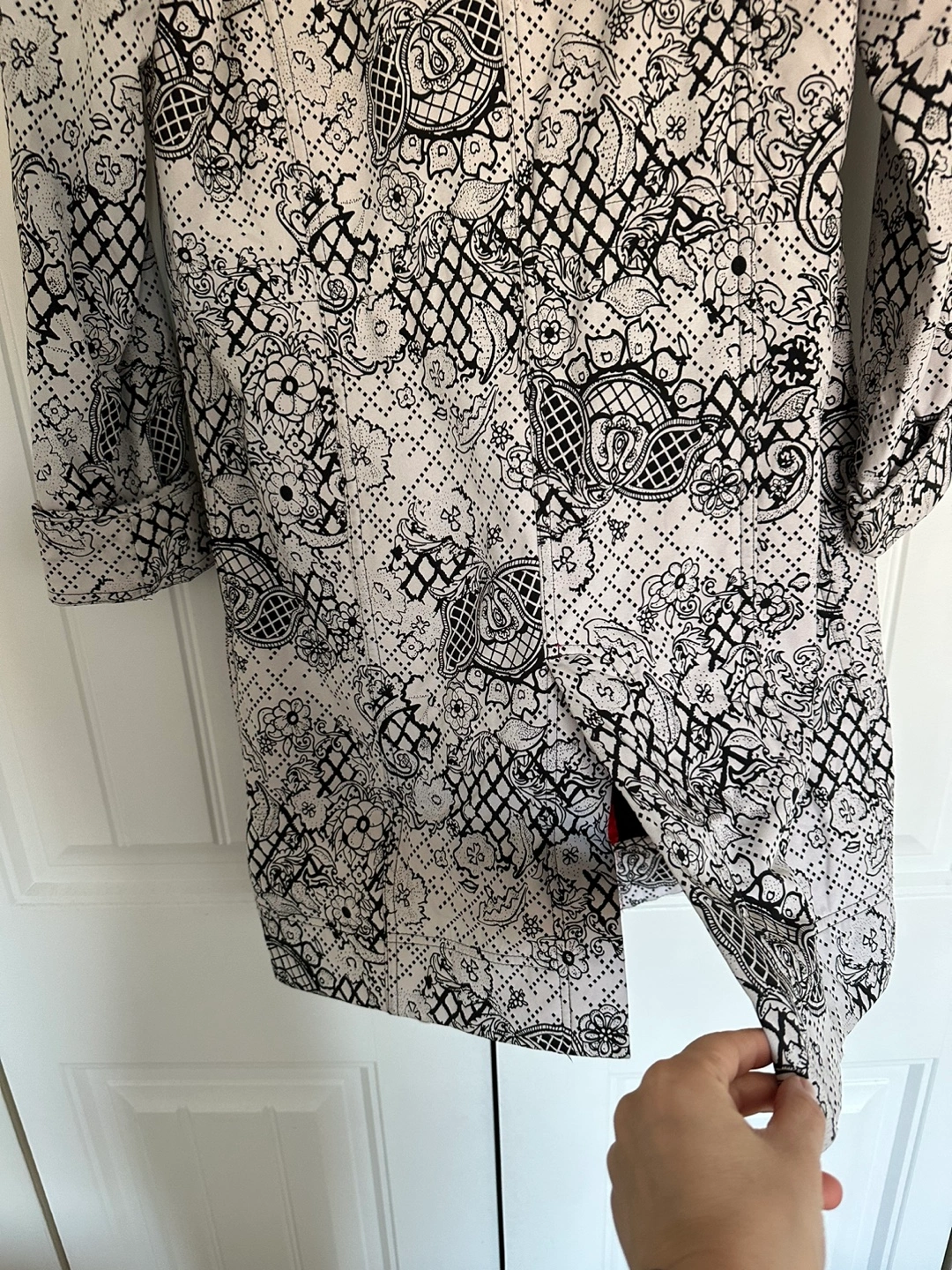 Black and white floral print. Long sleeves. Full zip closure. Excellent condition. It is knee-length and has been very lightly used. The fleece-lined interior makes it perfect for spring and fall, keeping warmth inside.No defects, in excellent condition.