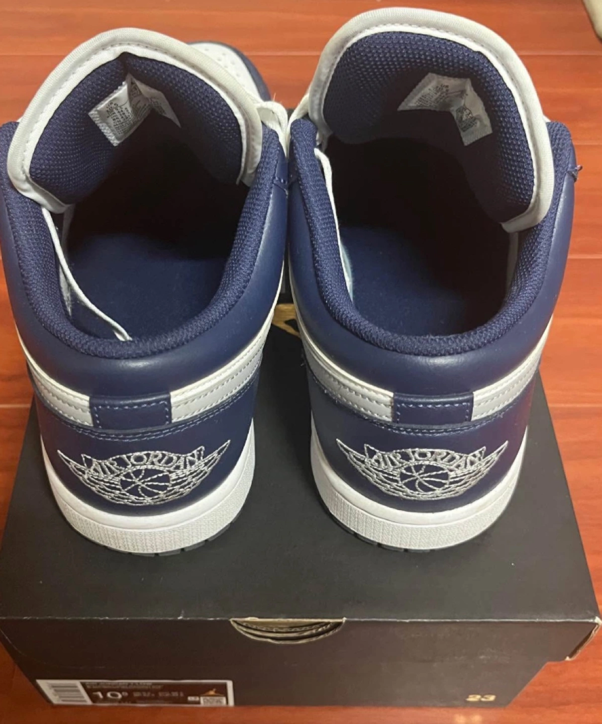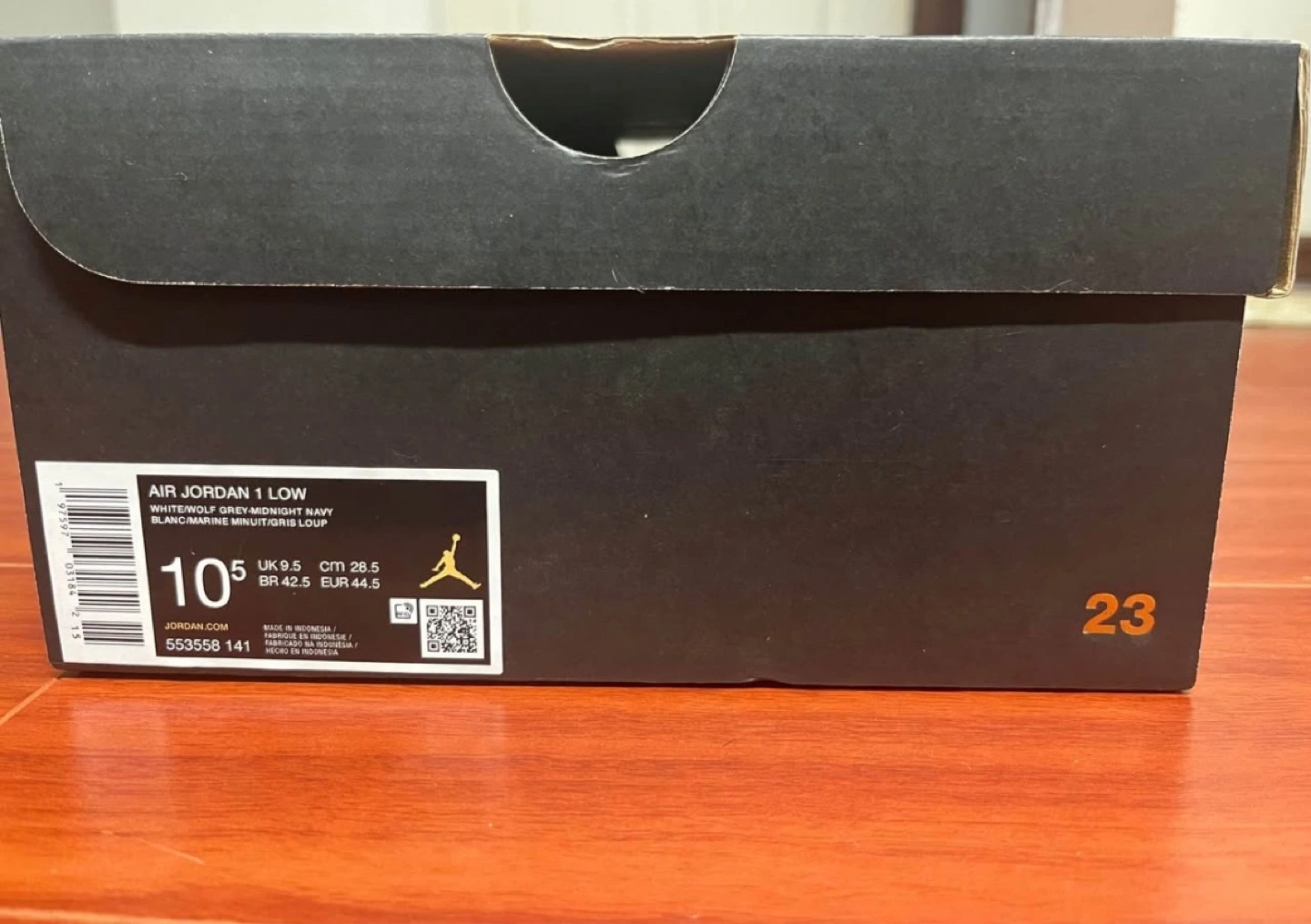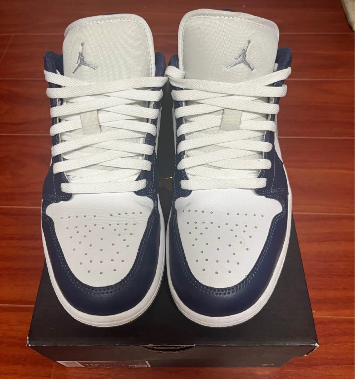 Air Jordan 1 Low sneakers. White, Wolf Grey, and Midnight Navy colourway. Size UK 9.5, CM 28.5, BR 42.5, EUR 45.5. New in box.