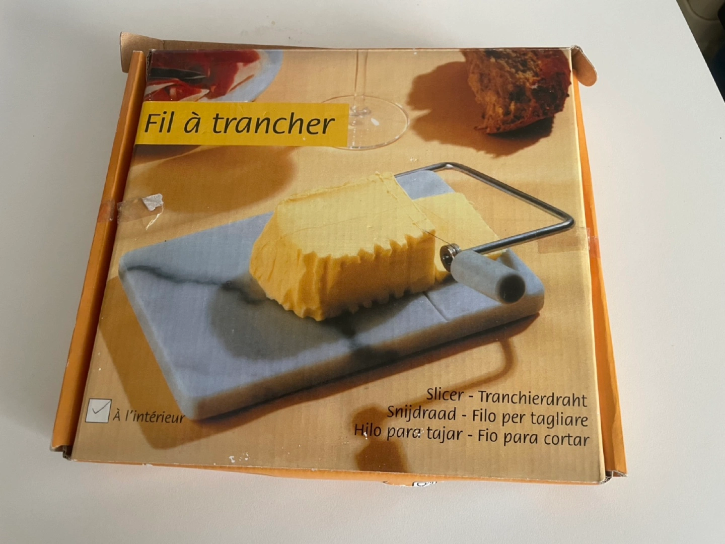 Unused vintage cheese slicer. Features a marble board and wire slicer.