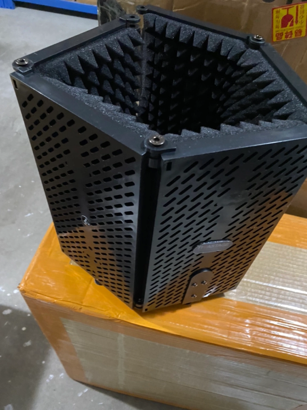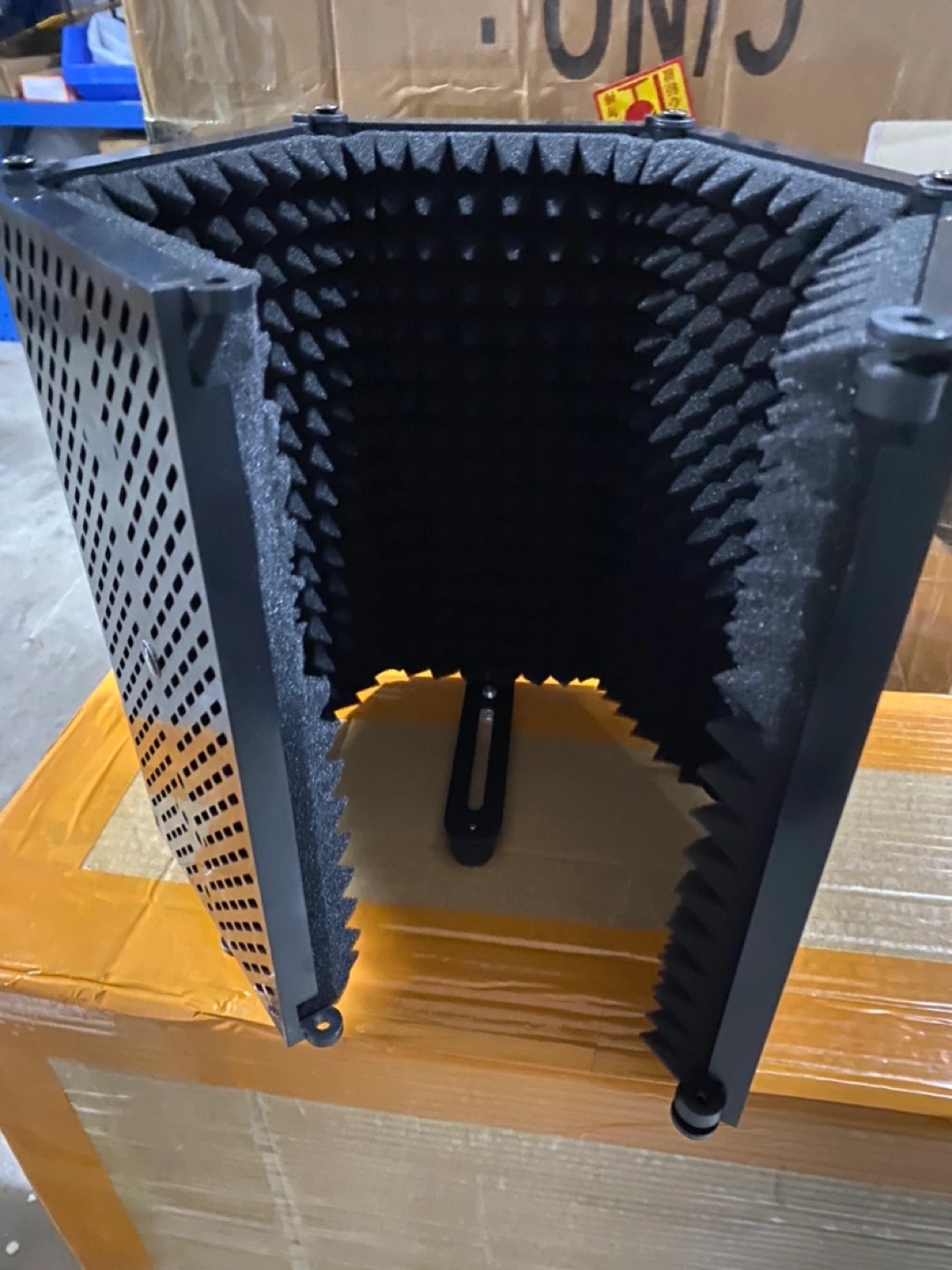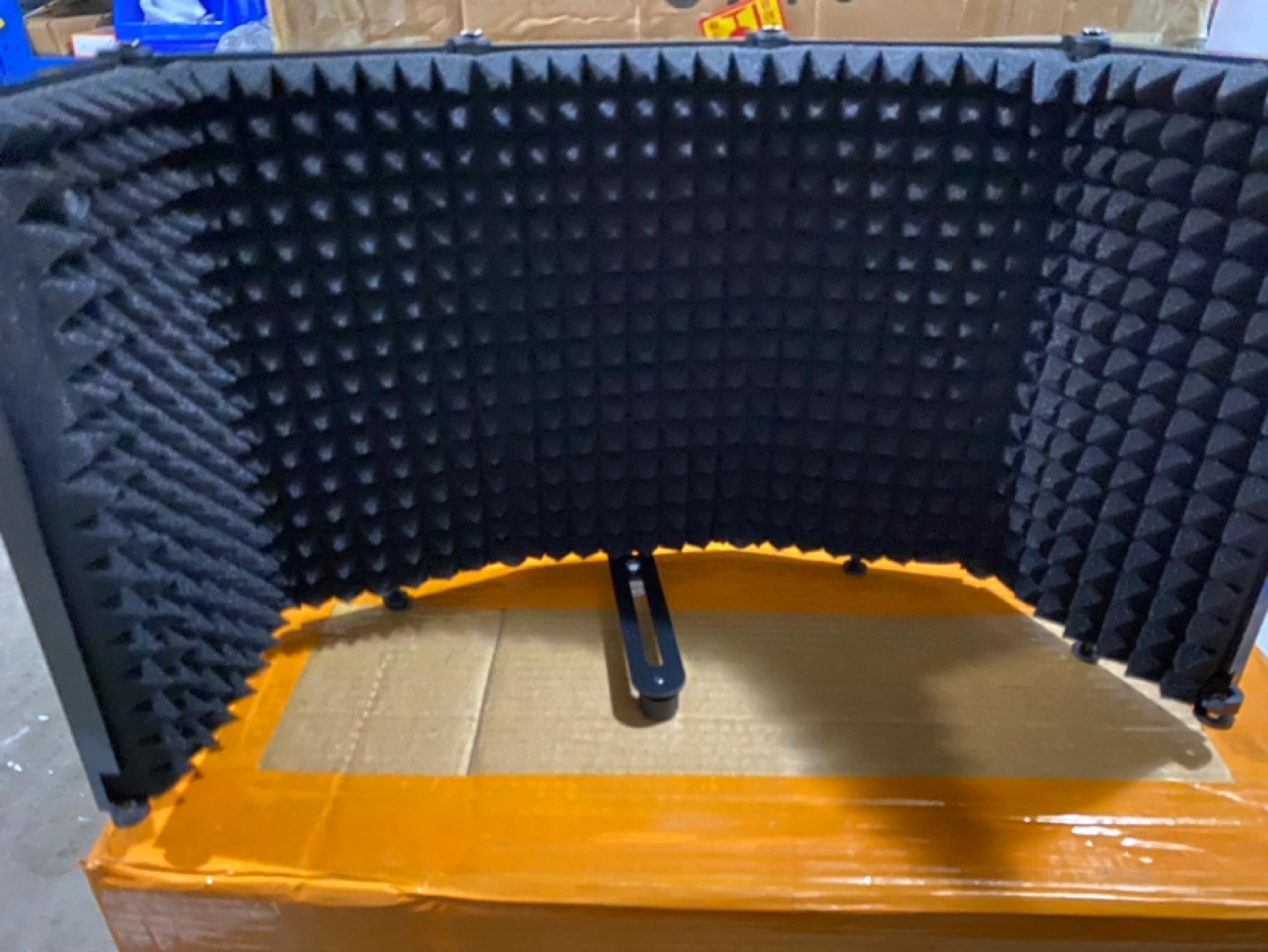 Foldable microphone isolation shield. Reduces background noise. Great for podcasting and recording. Includes mounting bracket. Black colour.