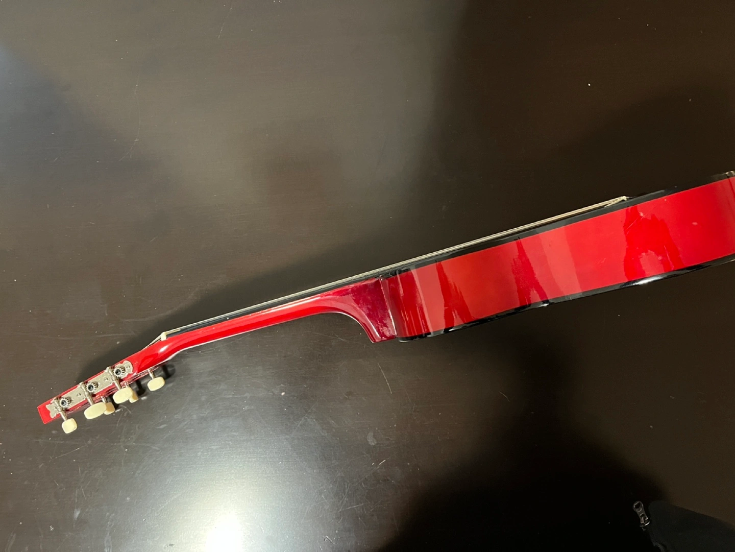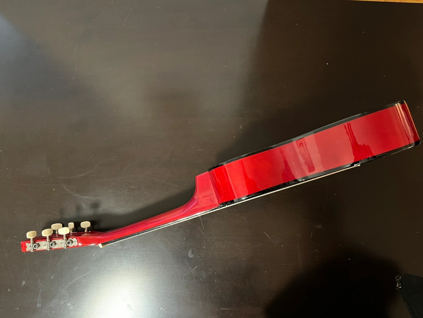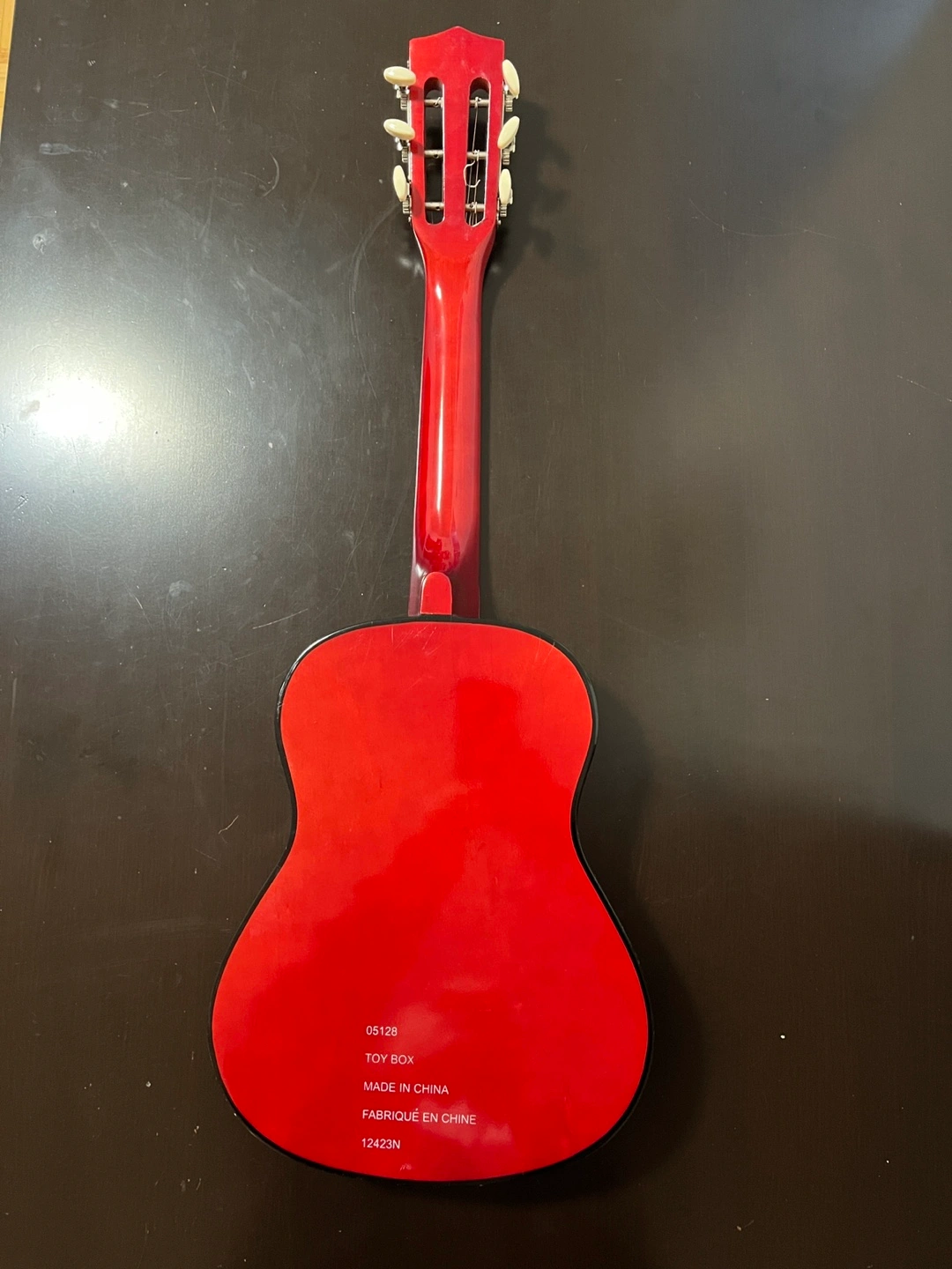 Red and natural wood finish. Six strings. Made in China. Great for beginners.