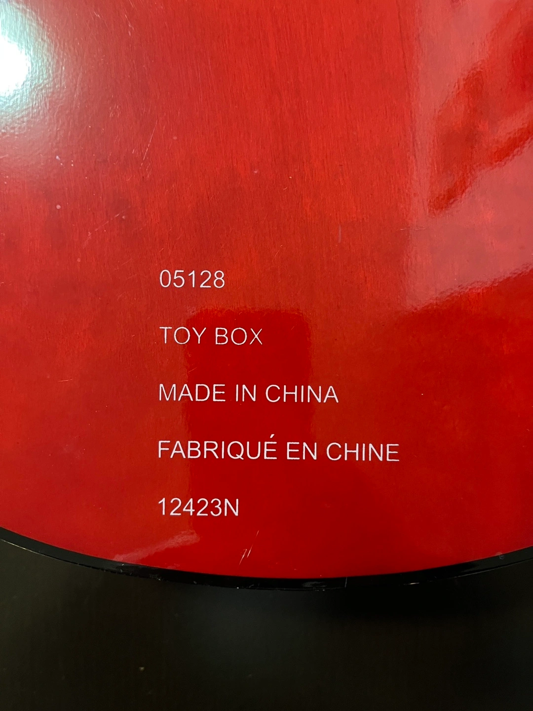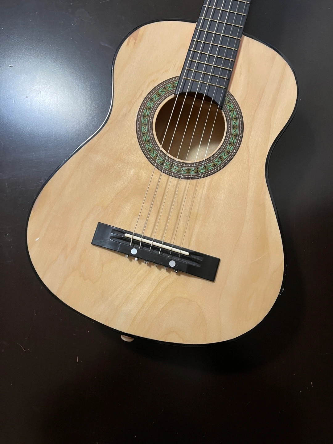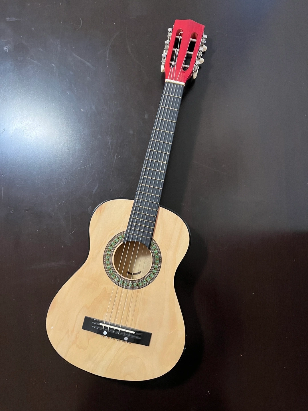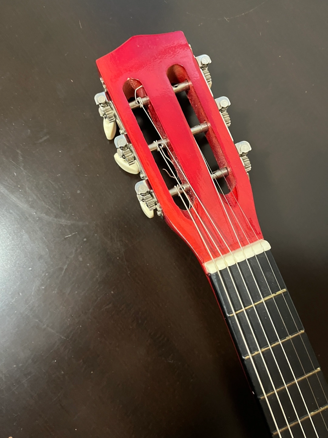 Red and natural wood finish. Six strings. Made in China. Great for beginners.
