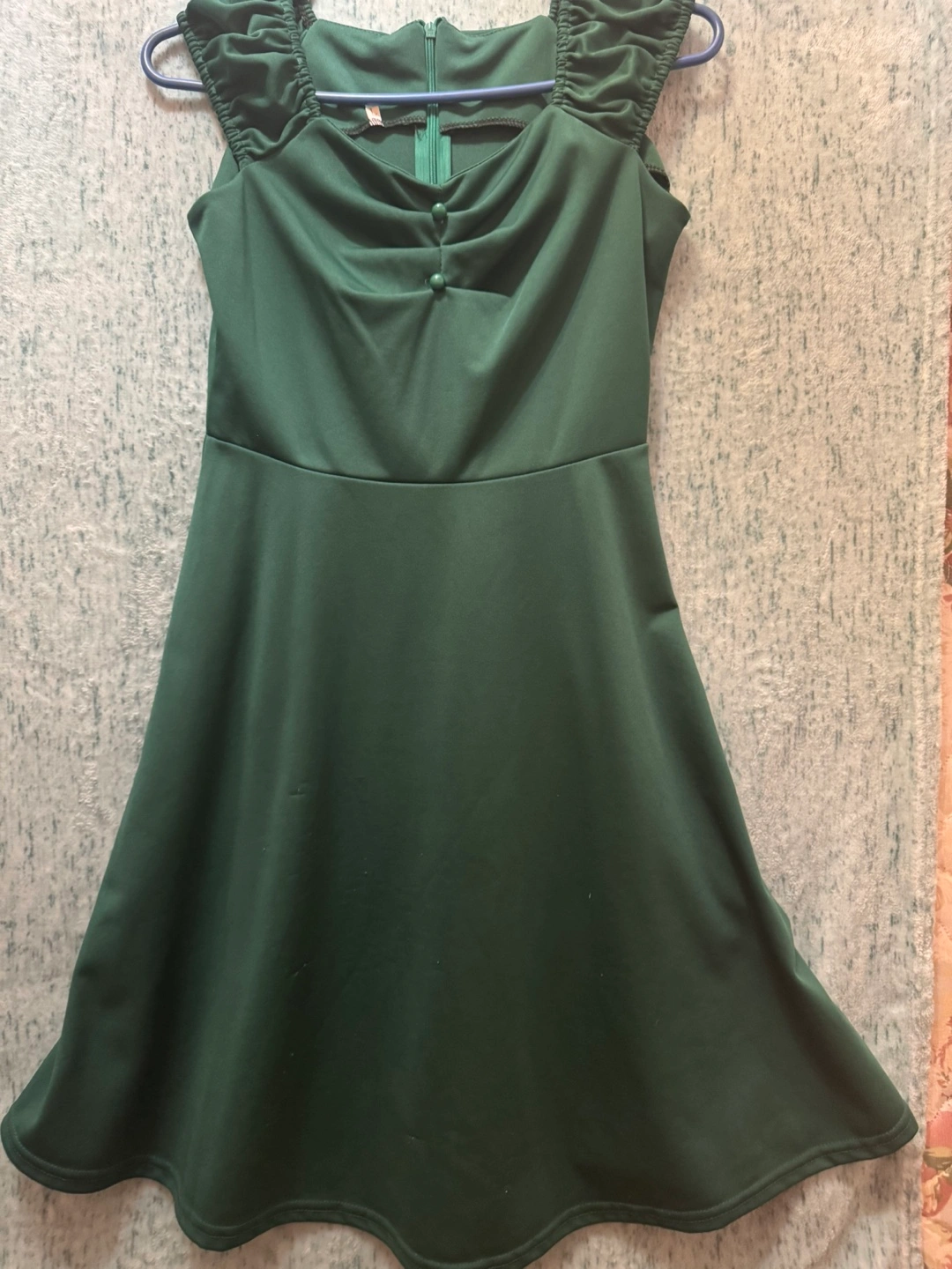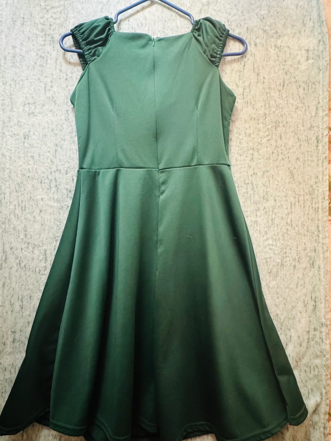 Beautiful dark green dress. A-line silhouette. Features puffed sleeves and a fitted bodice. Hidden zipper closure. Perfect for summer events.For pick up only