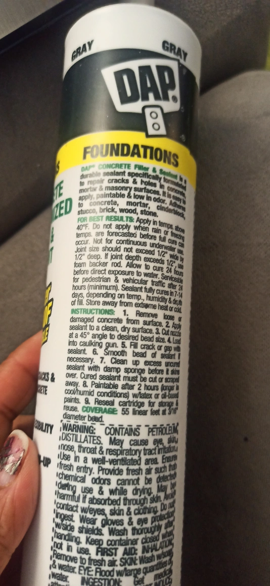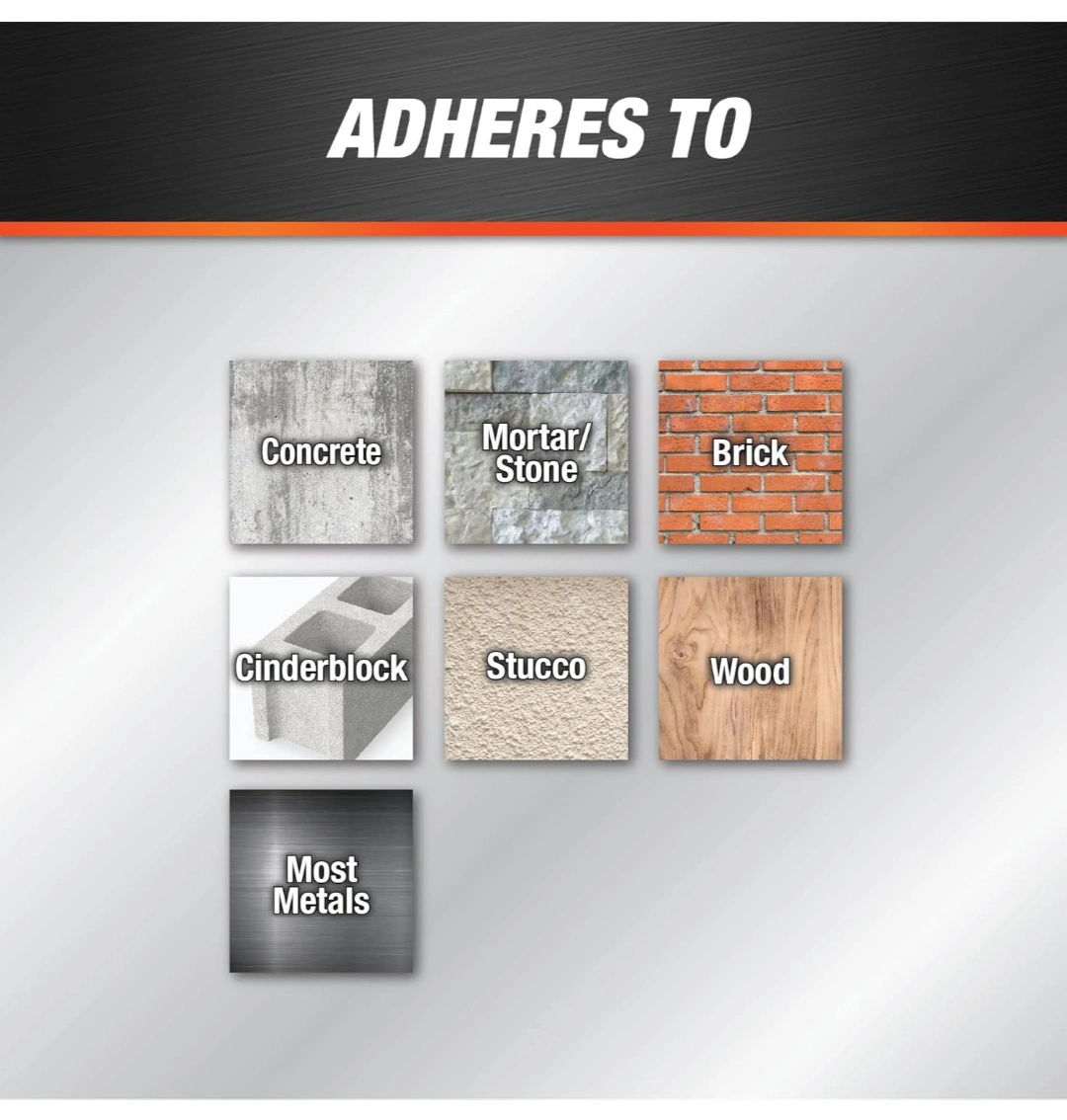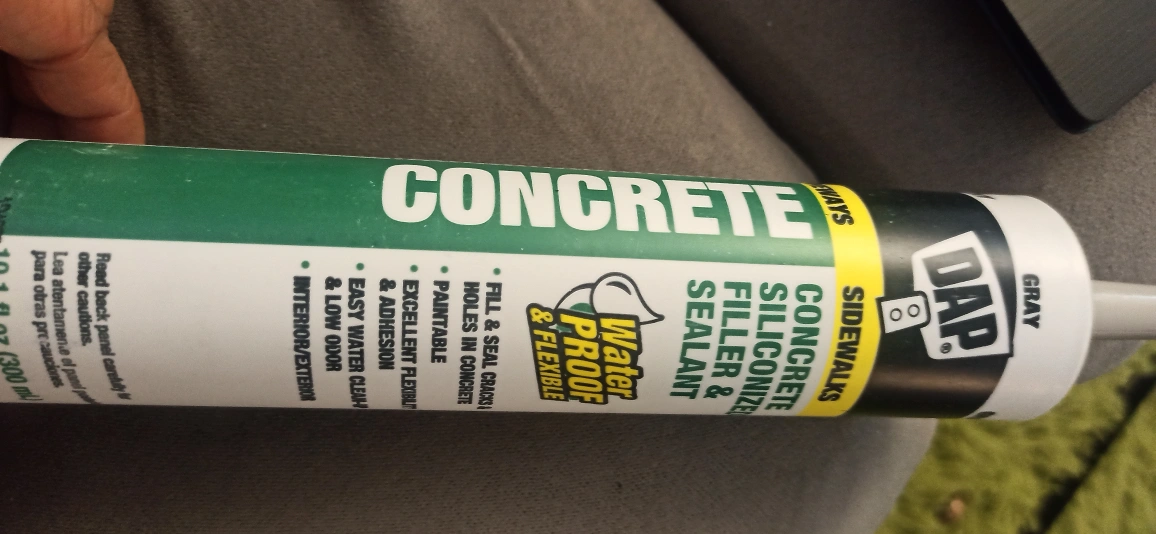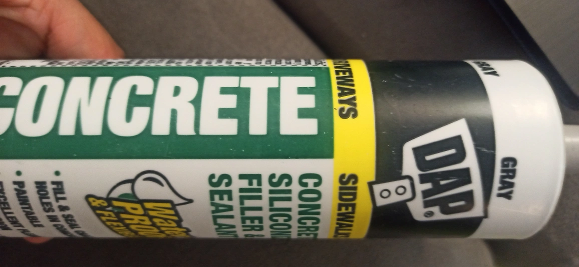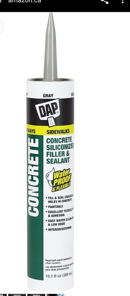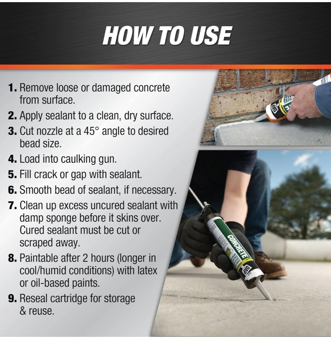 Gray concrete silicone filler and sealant. Waterproof and flexible. Fills and seals cracks and holes in concrete. Paintable. Interior/exterior use. 10.1 fl oz (300 mL). Sidewalk use.