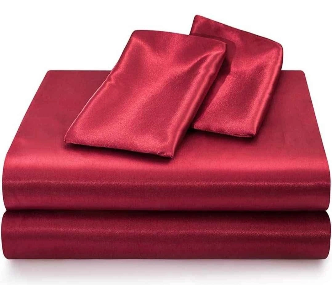 Luxurious satin sheet set. Includes flat sheet, fitted sheet, and two pillowcases. Deep burgundy colour. Soft and smooth.