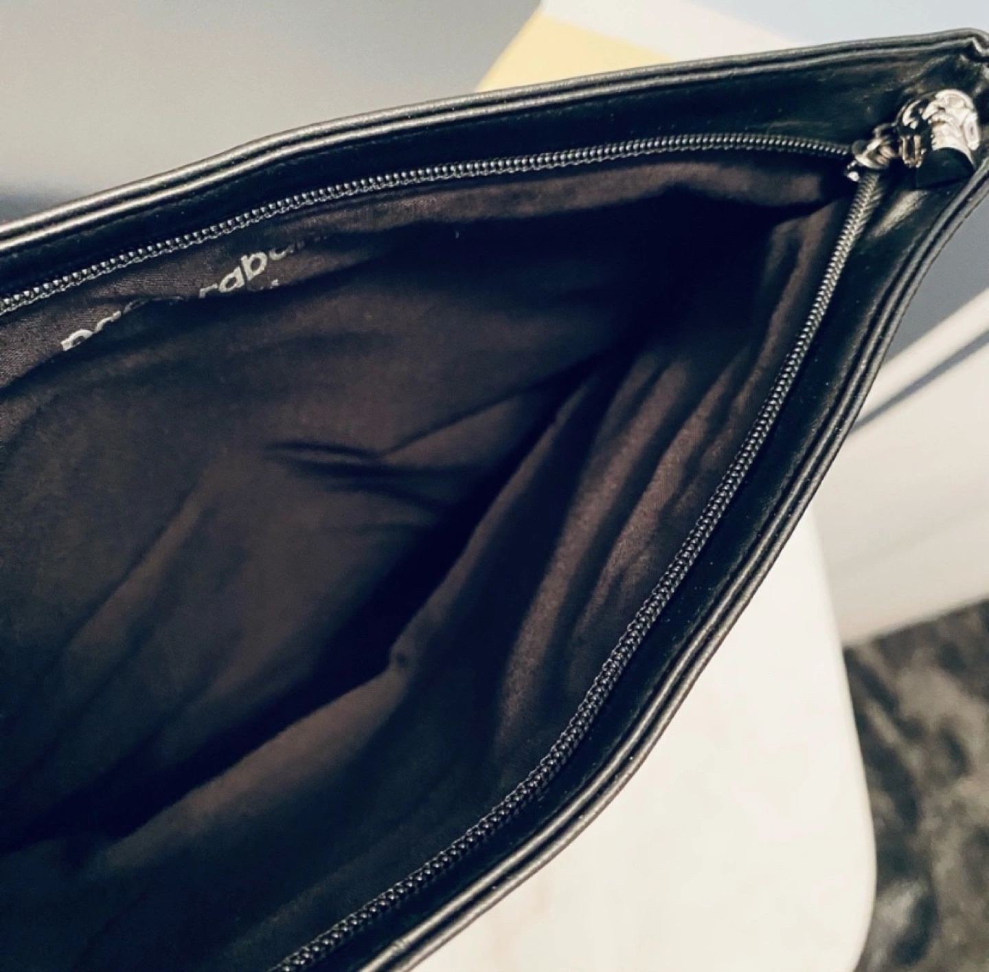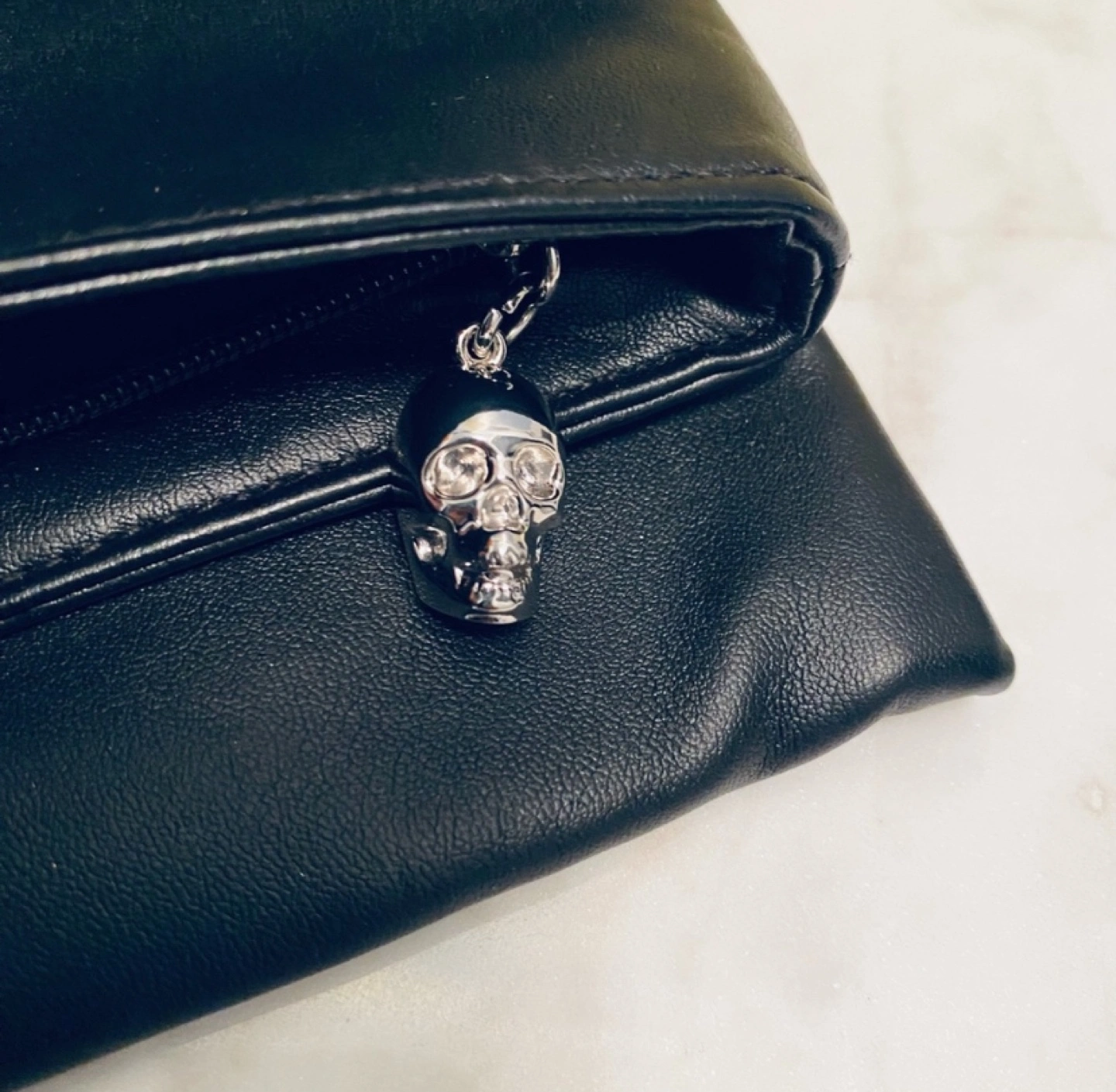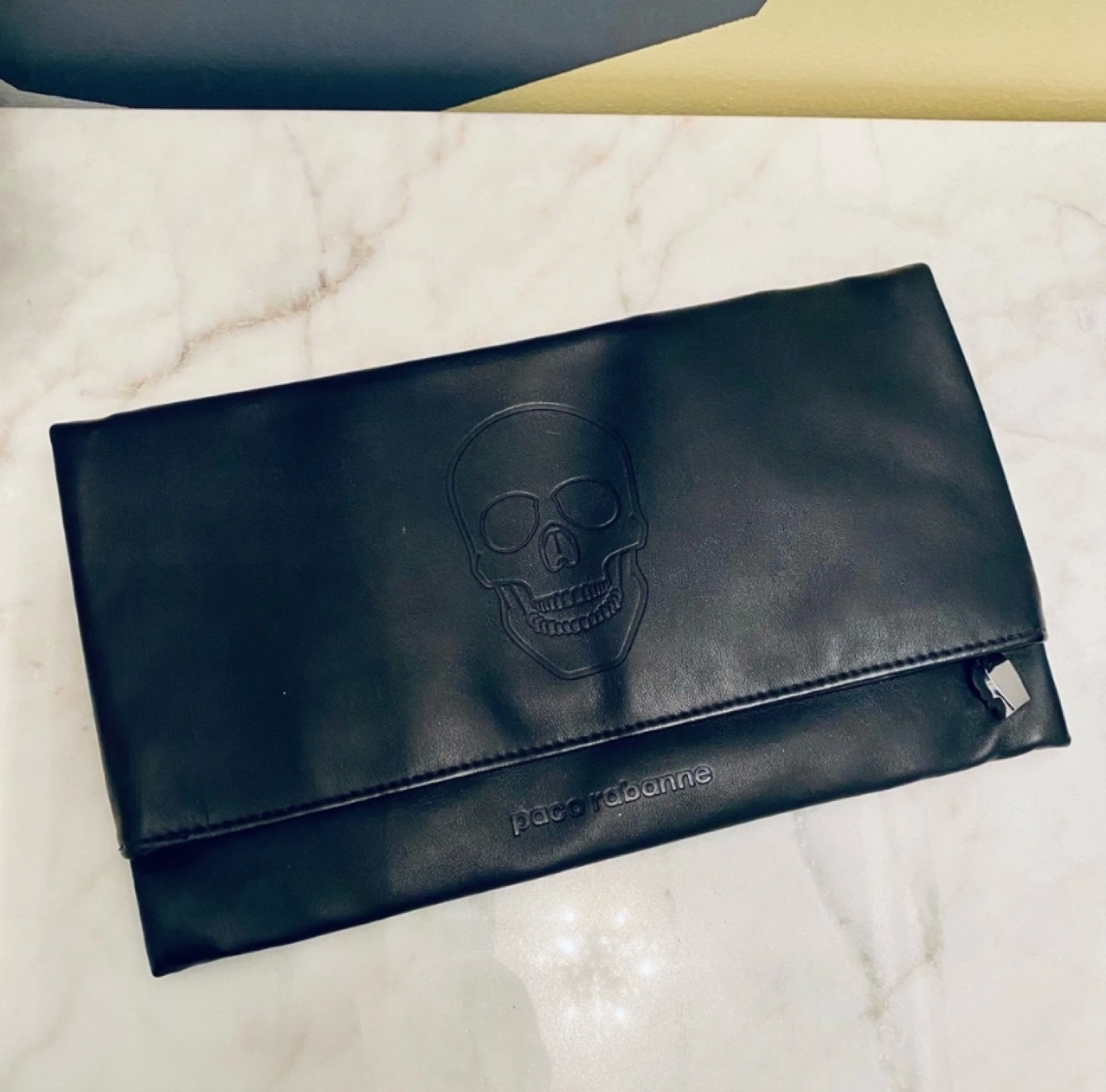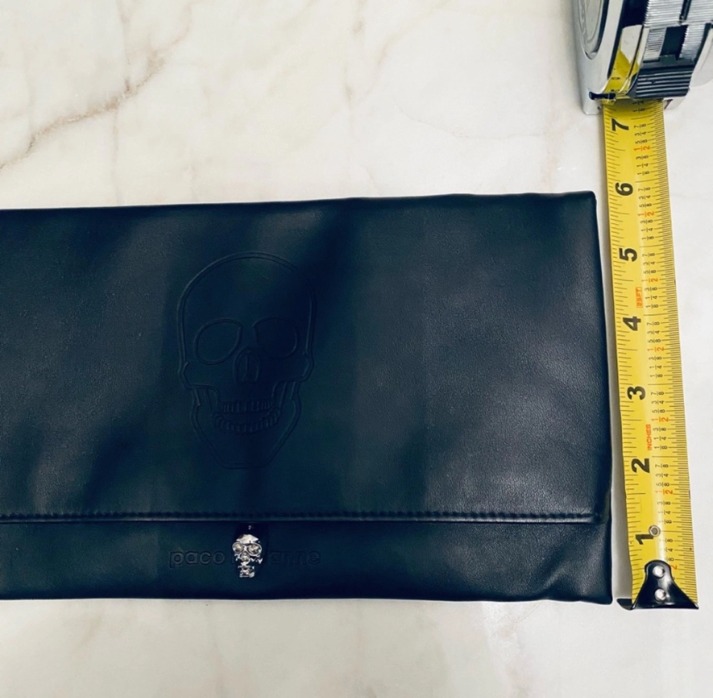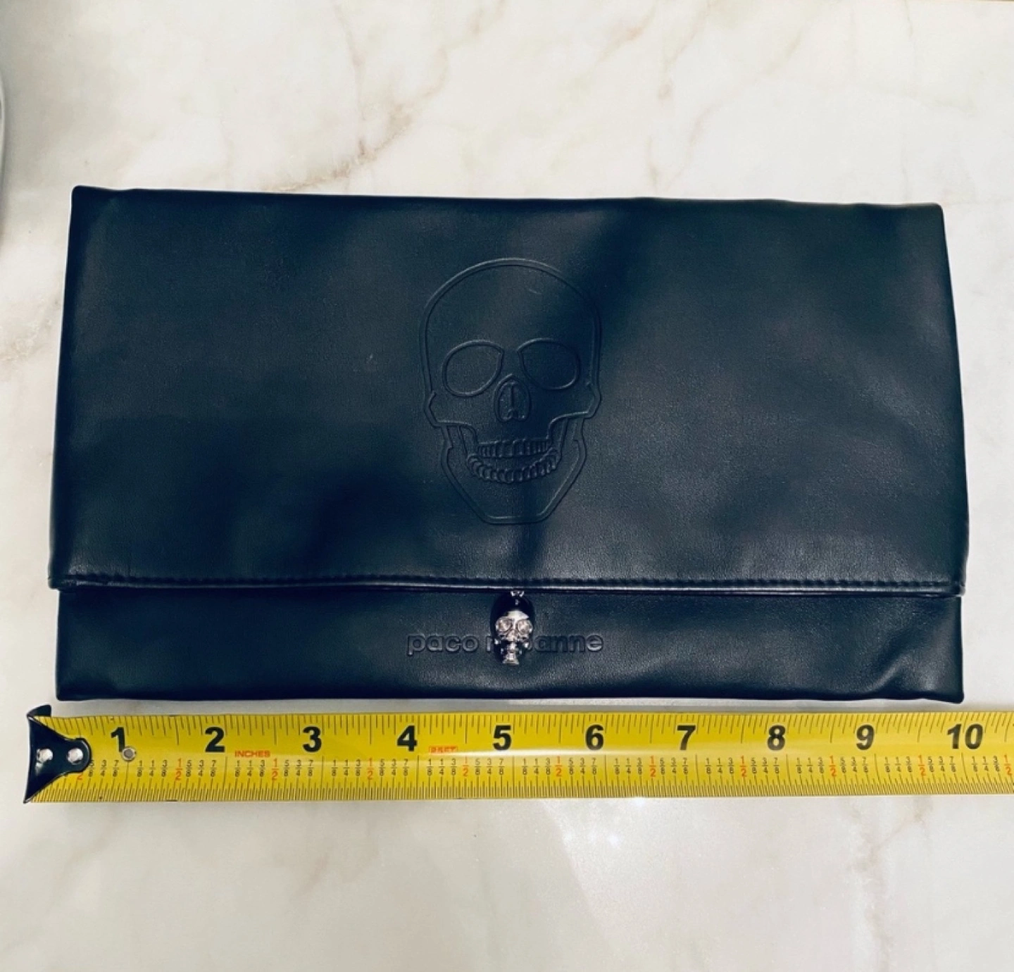 Black faux (vegan) leather clutch. Features embossed skull design and a skull zipper pull. Small, compact size. Excellent for evenings out. New without tags and giftable. Cool vintage piece that can be used as an evening bag, a travel wallet, or a cosmetic case. Has thick skull zipper pull and a unique fold over design. Can hold a lot - large enough for any smartphone! See all pics for measurements.