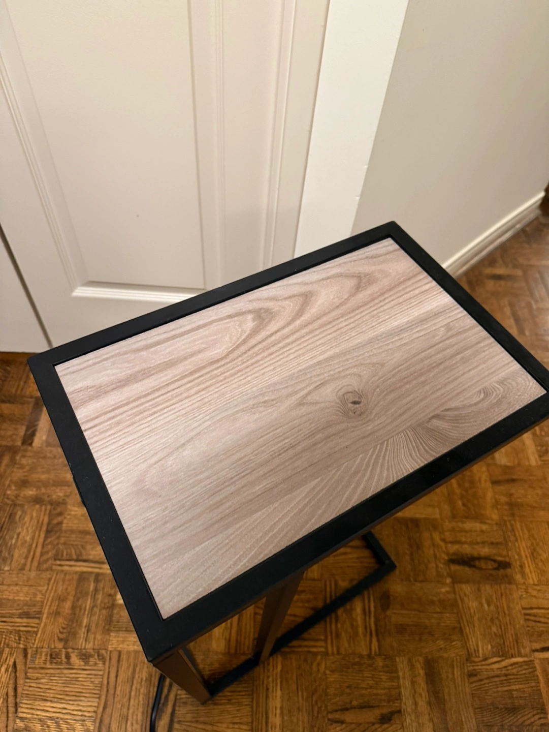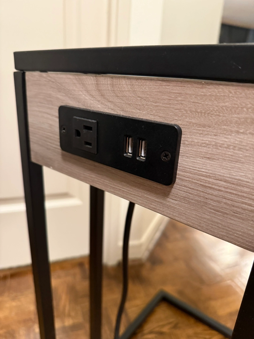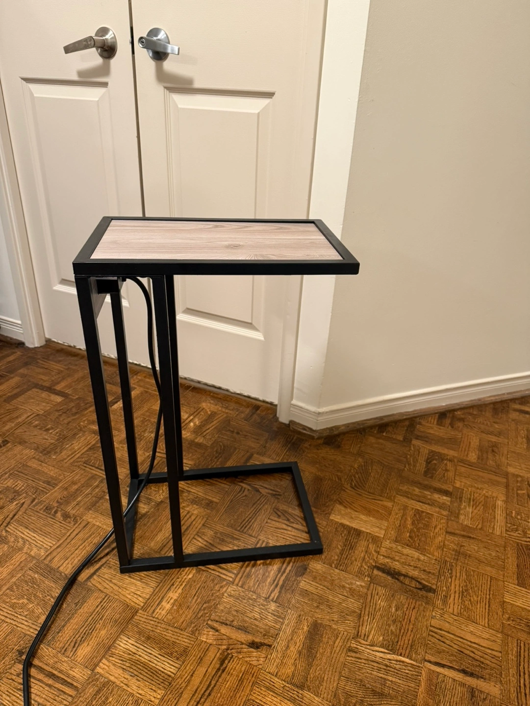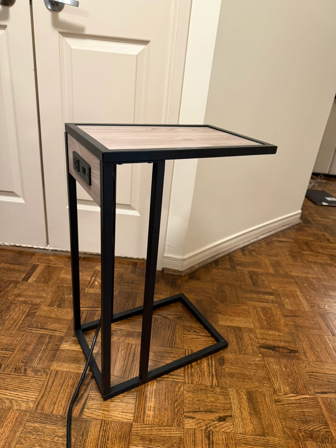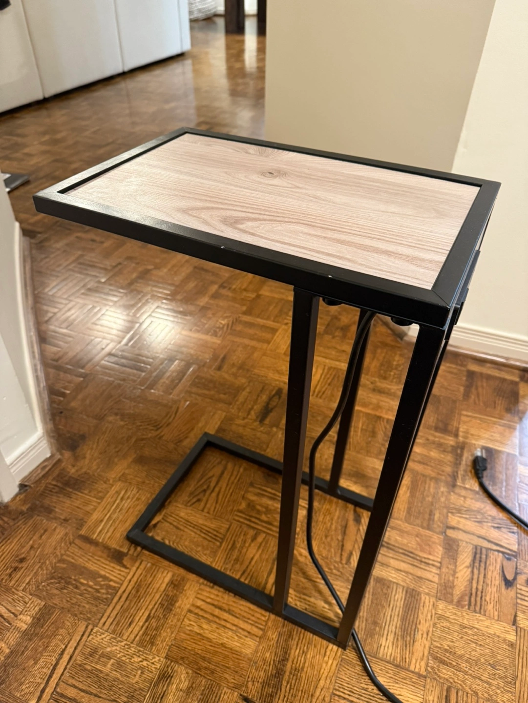 Modern C-shaped end table. Features a convenient built-in power outlet and two USB ports. Sleek black metal frame and light wood-grain top. Perfect for a living room or beside a couch. In very good condition except for 2 small scratches on the metal
