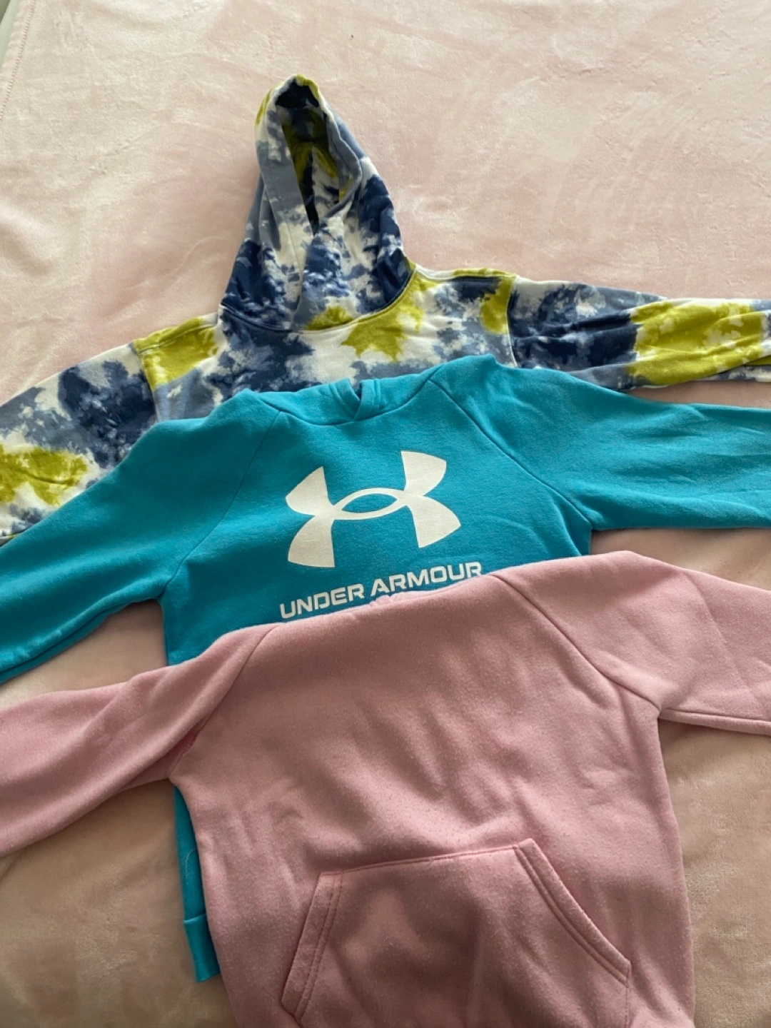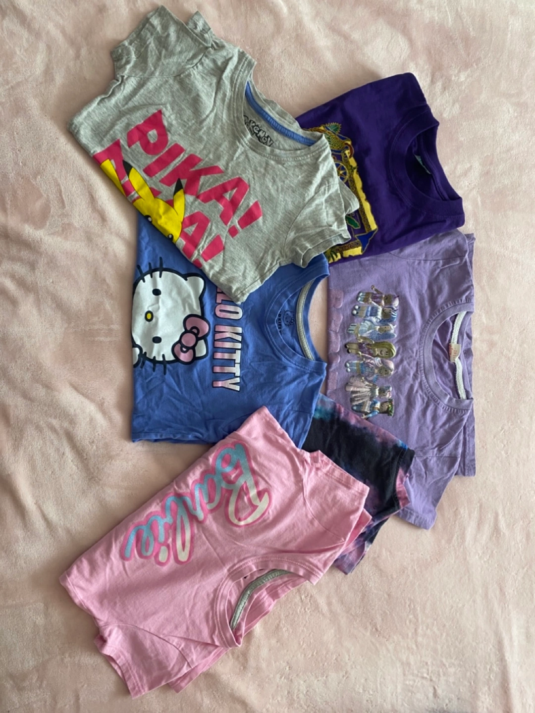 Large bundle of girls' clothing. Includes graphic tees, swimsuits, leggings, shorts, hoodies, pj’s and long-sleeve shirts. Various sizes and designs. Character themes include Roblox, Pokemon, Hello Kitty, Barbie, and more.