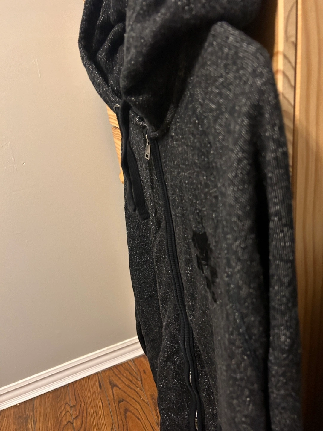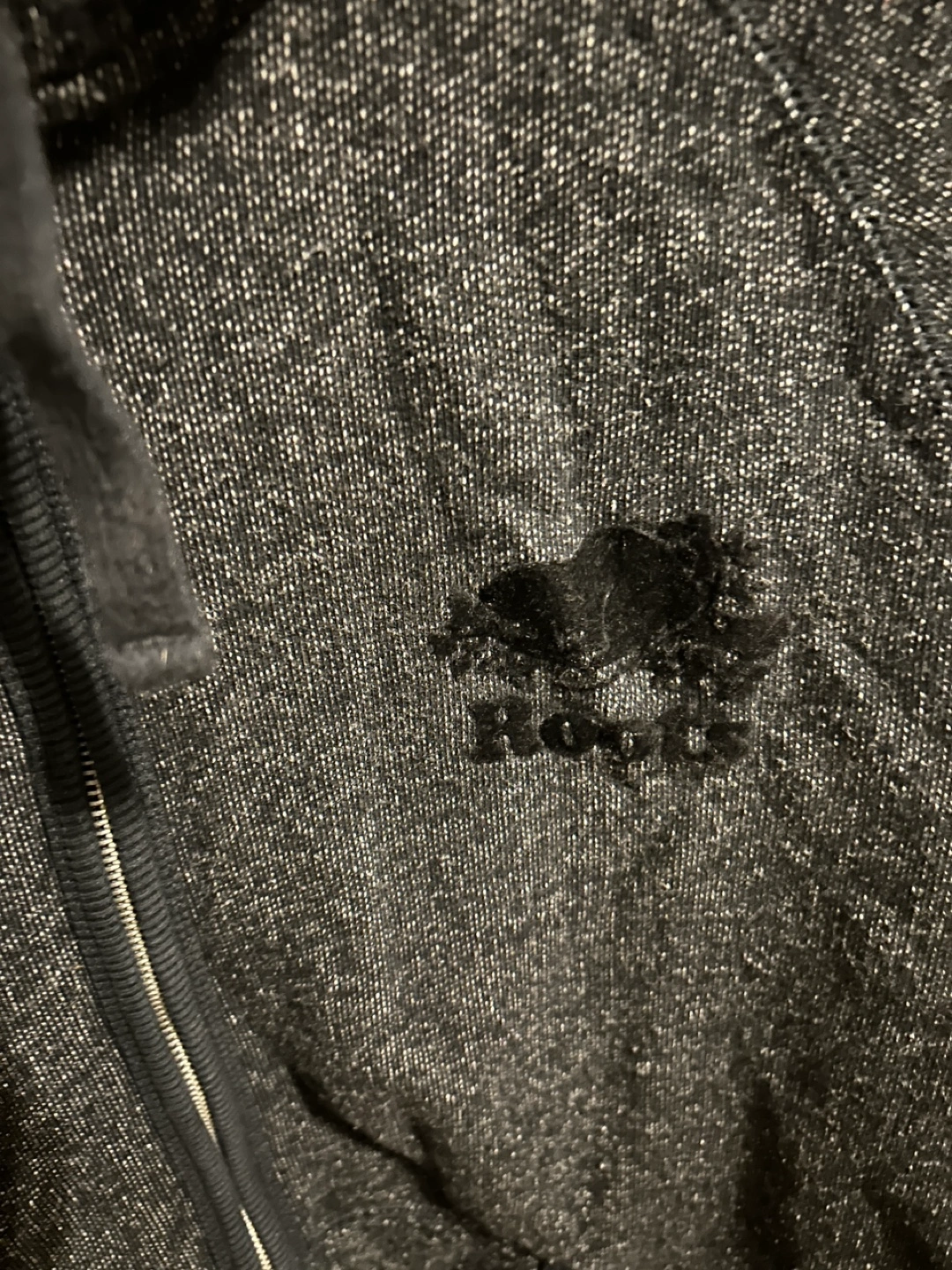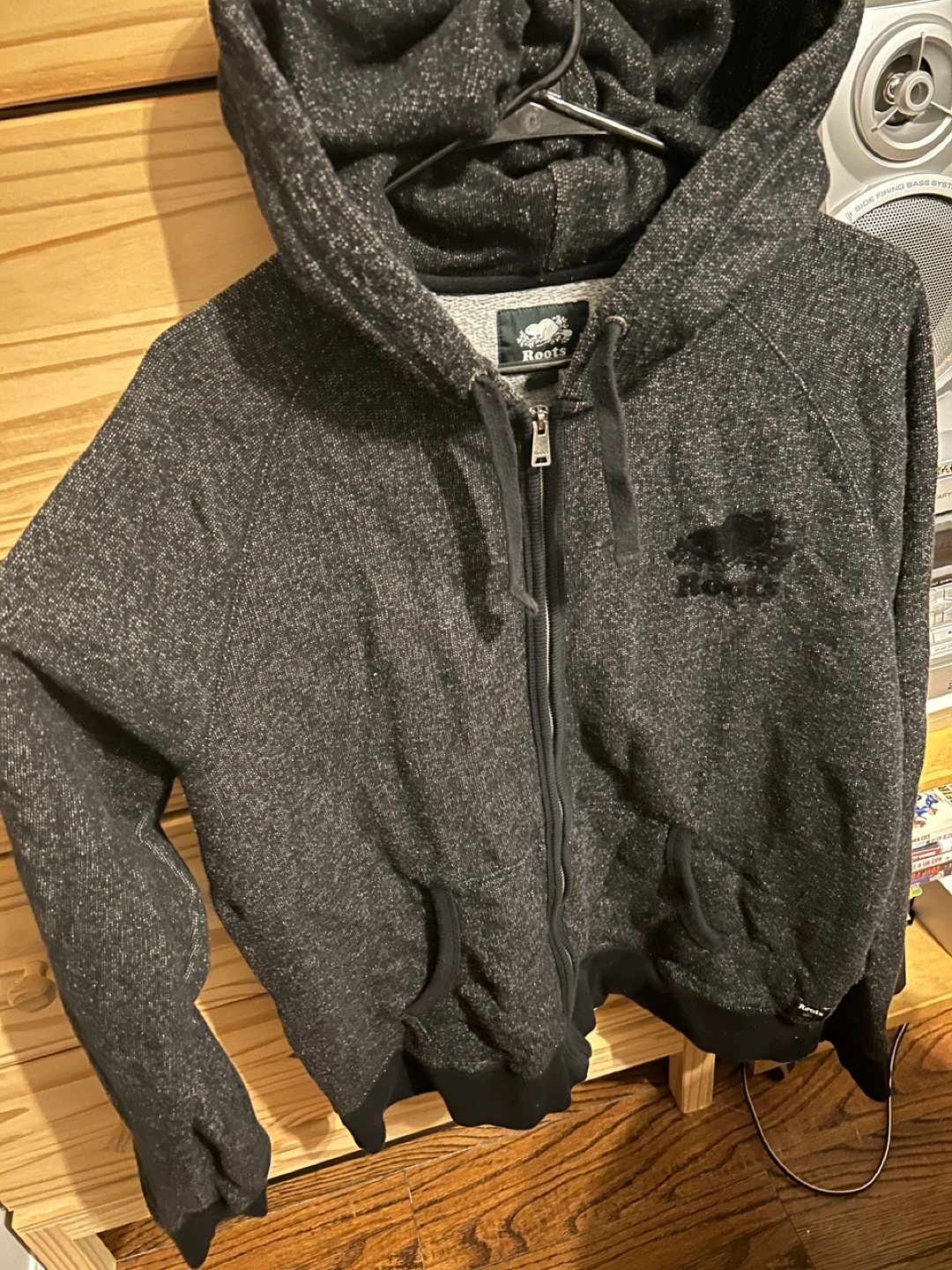 Men's dark grey zip-up hoodie. Features a Roots logo. Long sleeves, pockets. Great for casual wear.
