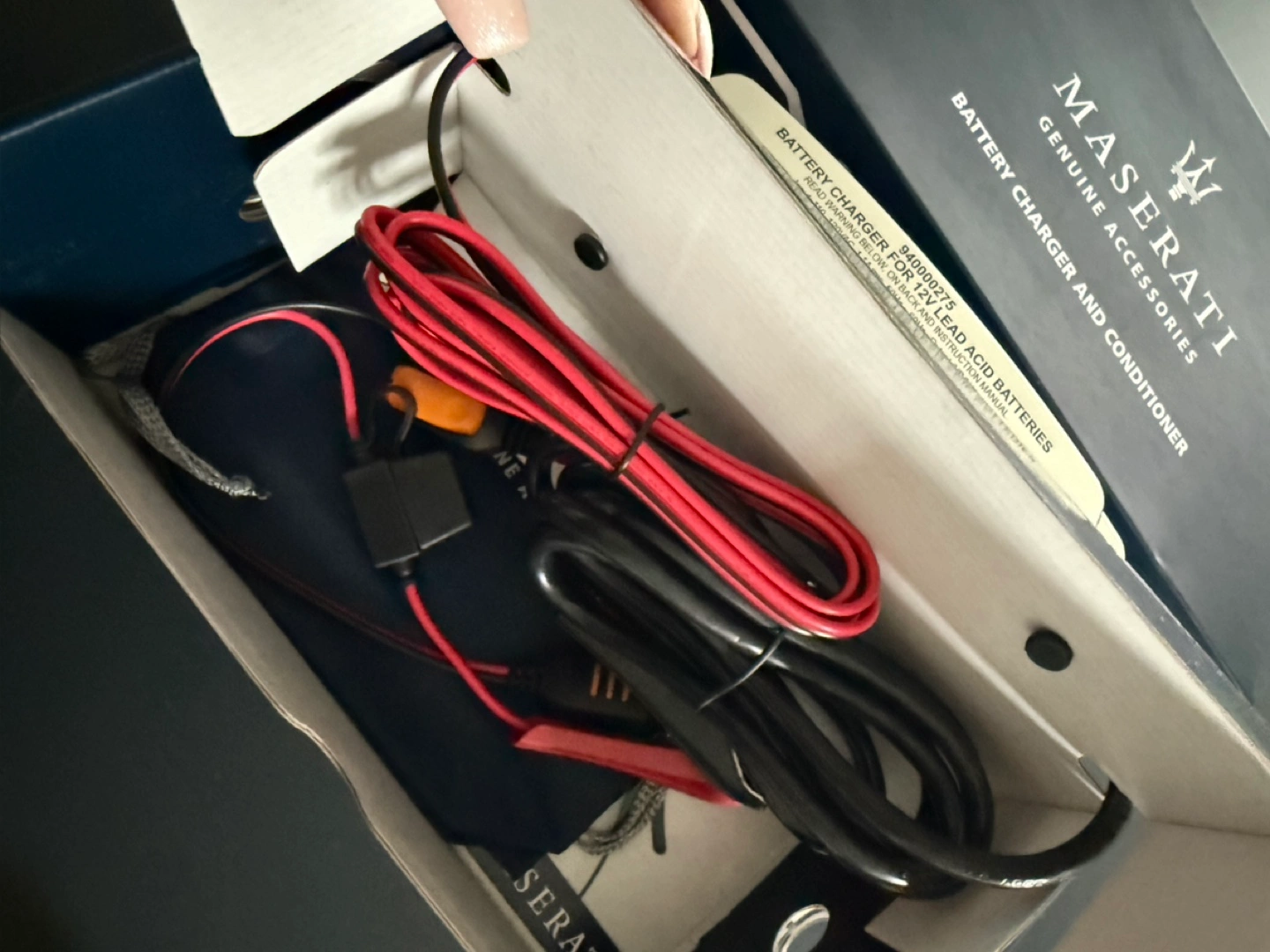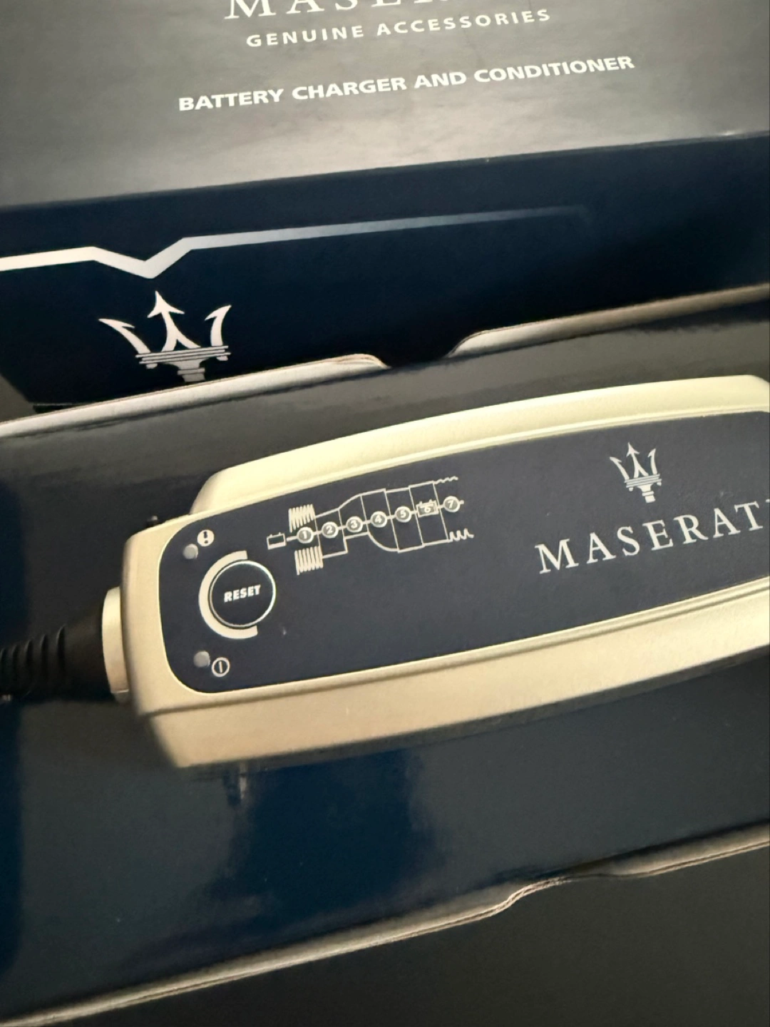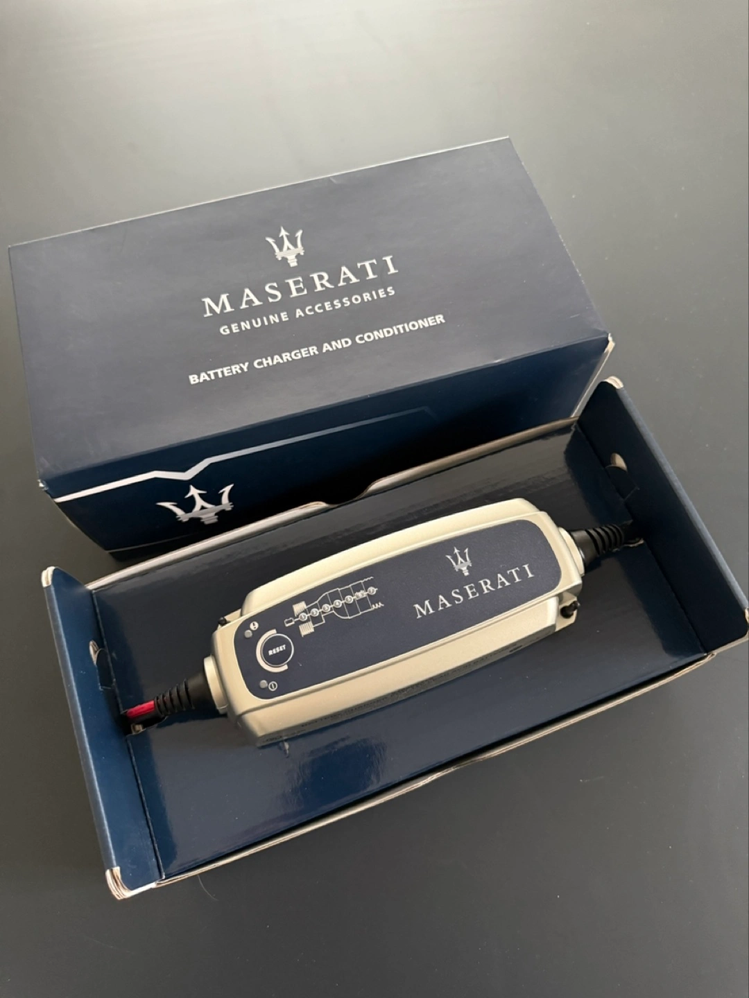 New Maserati genuine battery charger and conditioner. Includes all original packaging and accessories. Charges 12V lead acid batteries.