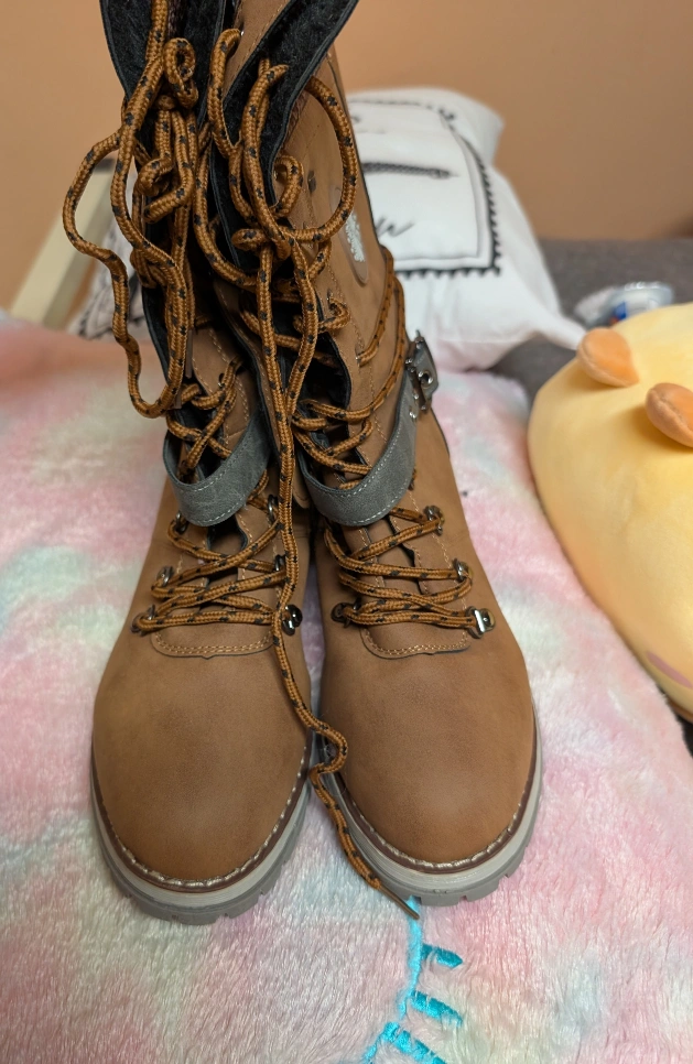 Stylish brown winter boots. Lace-up design with side zipper. Warm, comfortable, and perfect for cold weather. Features a chunky sole and textured accents.