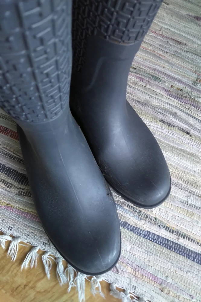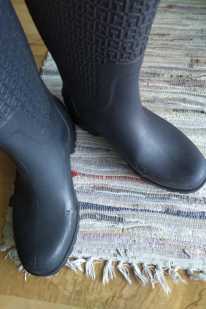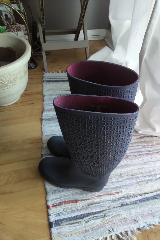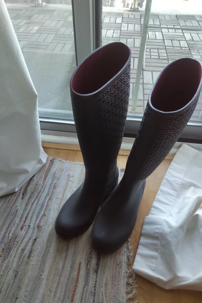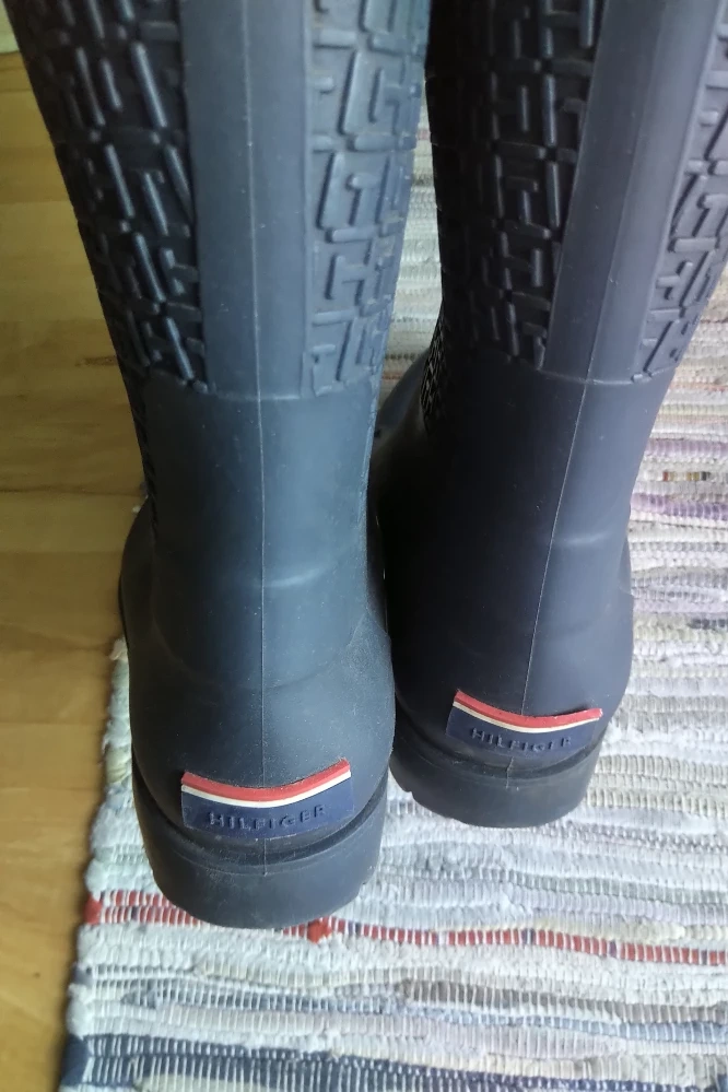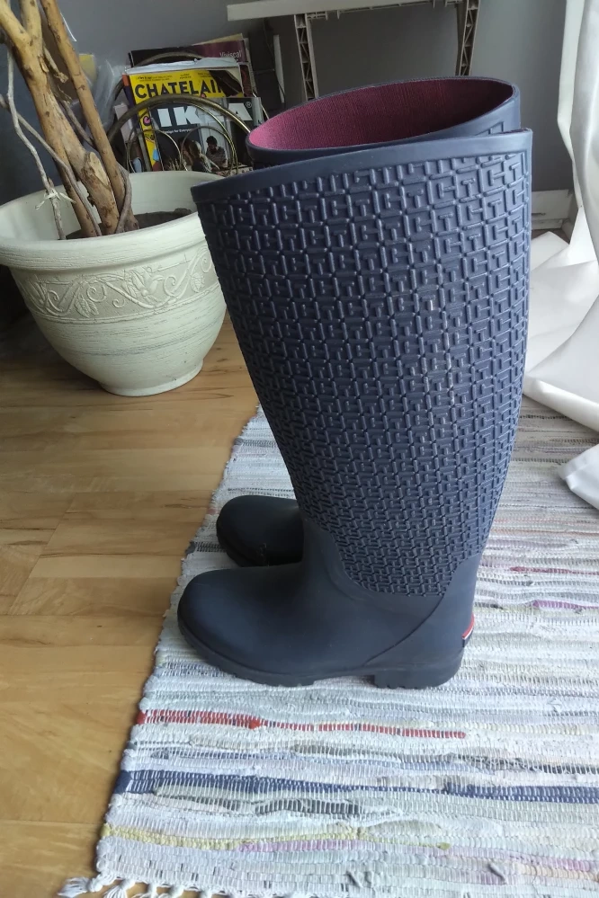 Pair of tall navy blue rain boots. Embossed Tommy Hilfiger logo. Rounded toe. Slight wear visible. beautiful Tommy boots in fantastic condition. very clean and gently worn. size 8 women pick up Weston rd@401 may accommodate at various locations within distance only