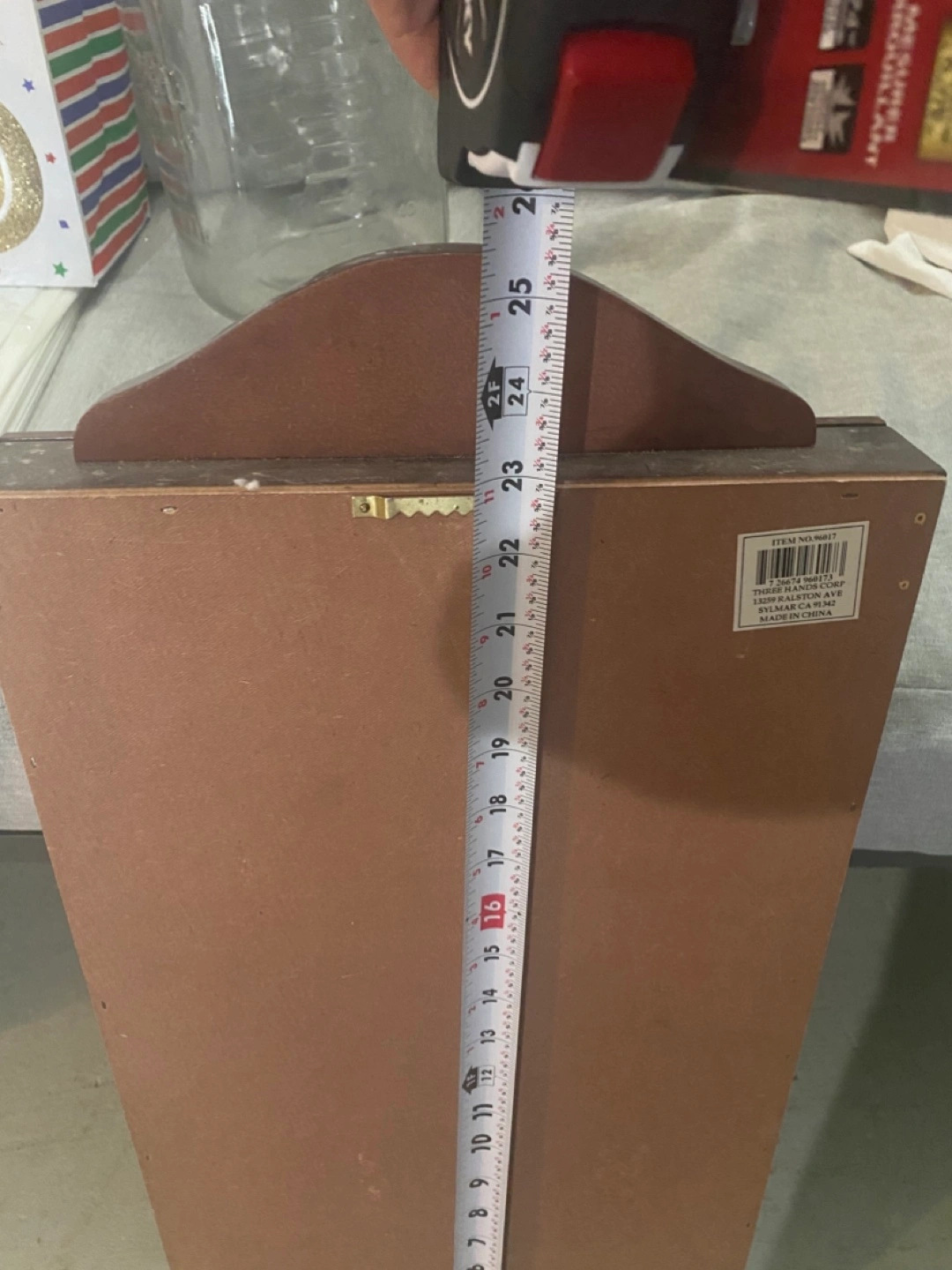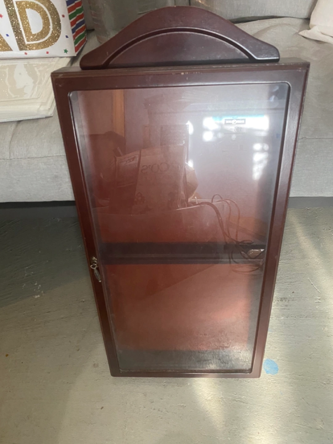 Dark brown wooden display case. Features a glass front, small shelf, and arched top. Measures approximately 24" tall x 12" wide. Includes hanging hardware. Smoke free home, perfect condition , just needs to be cleaned , with furniture polish . Picture shows dust , cleaned out basement.๐ค