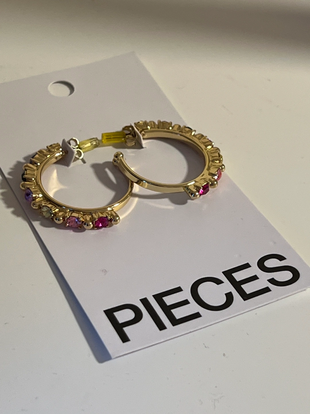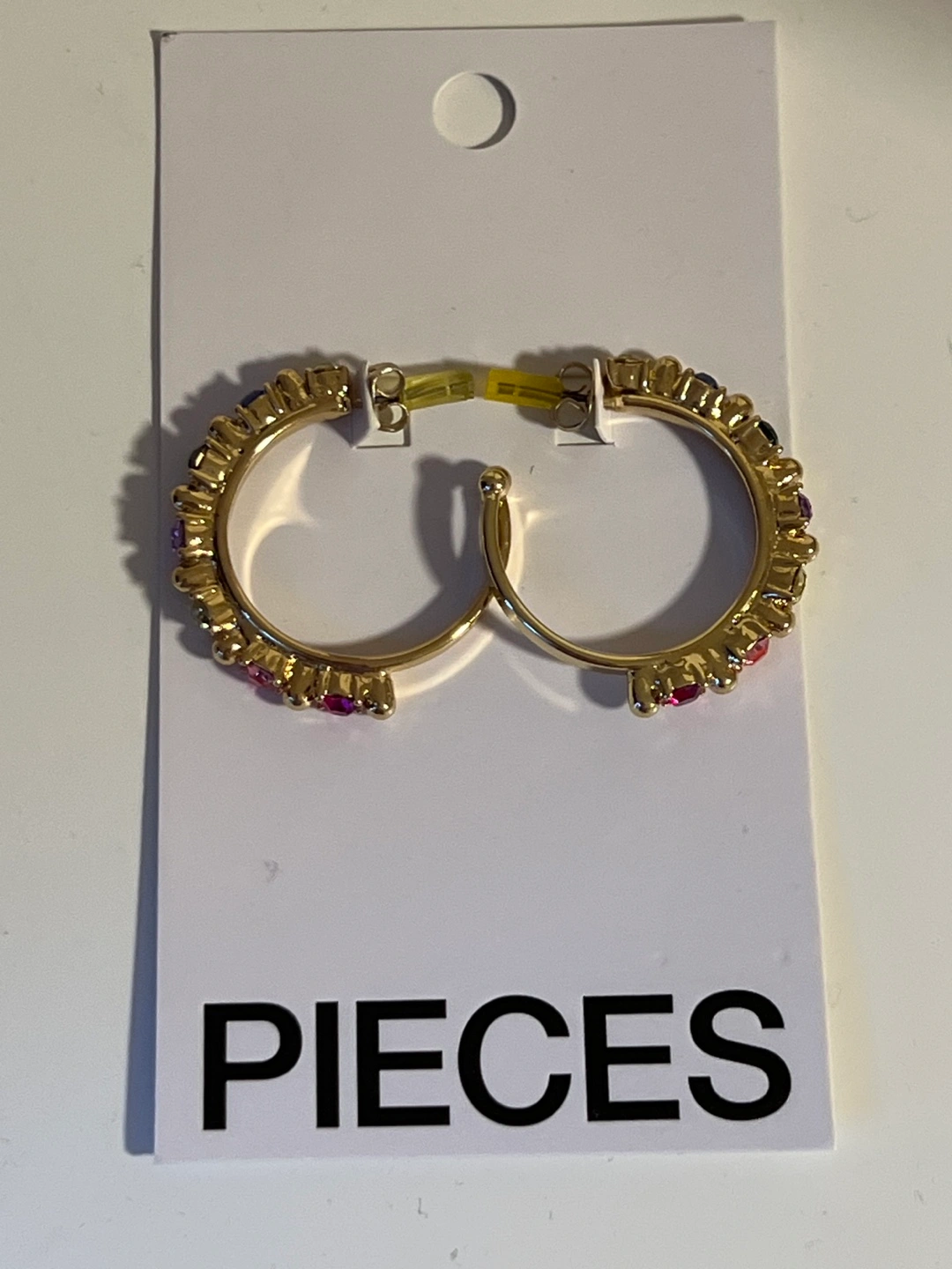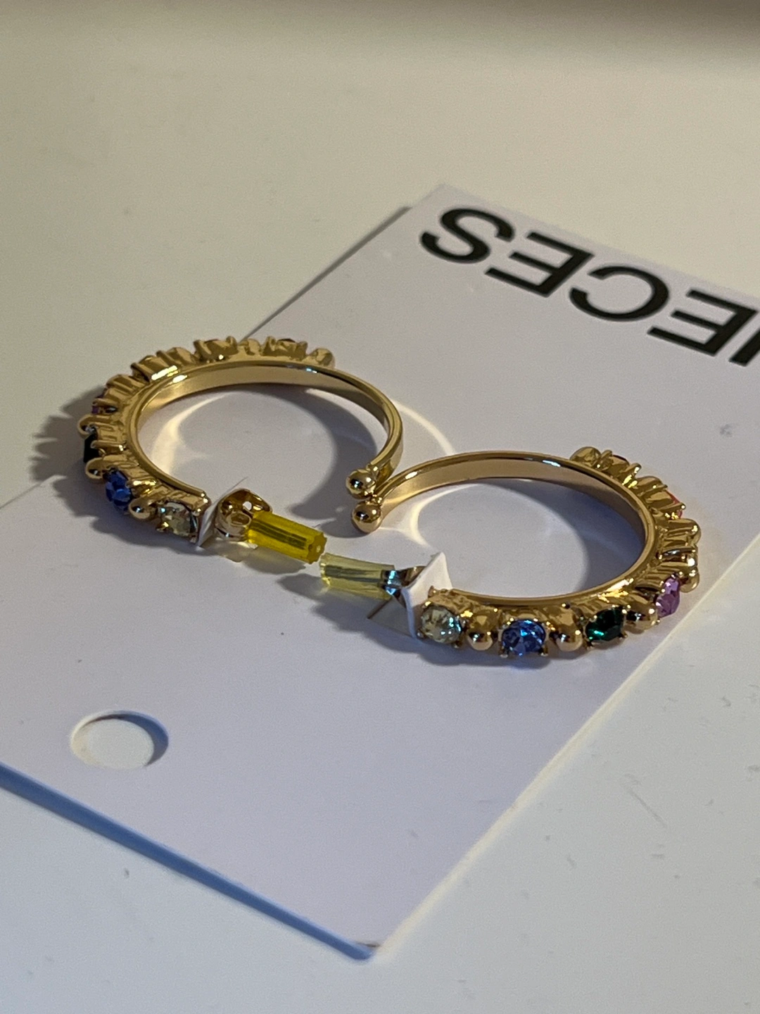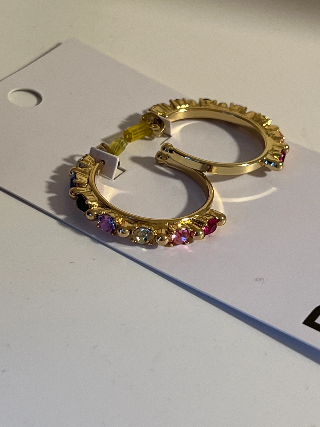 Gold-toned hoop earrings. Small colourful gemstones adorn the hoops. New with tags.