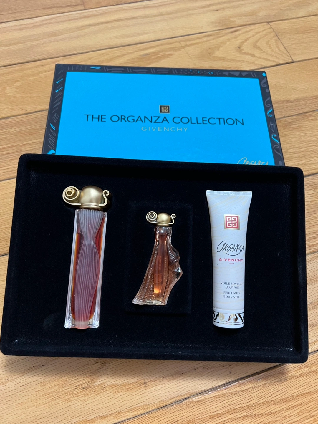 Givenchy Organza perfume gift set. Includes two perfume bottles and a perfumed body veil. New, never used, in original box.
