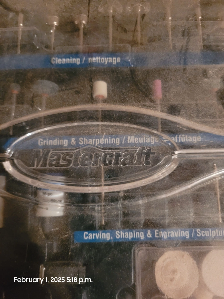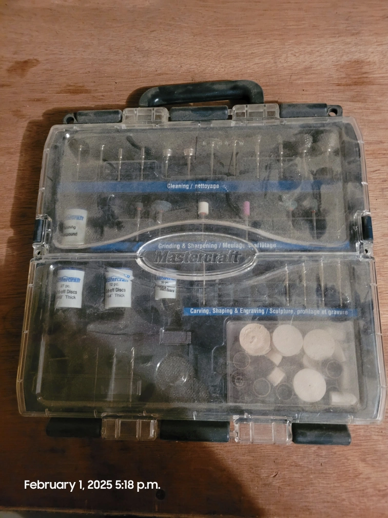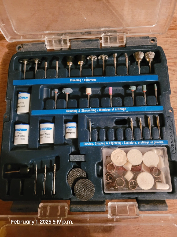 Complete rotary tool accessory kit. Includes various bits for cleaning, grinding, sharpening, carving, shaping, and engraving. Housed in a plastic carrying case. Ideal for hobbyists and crafters.