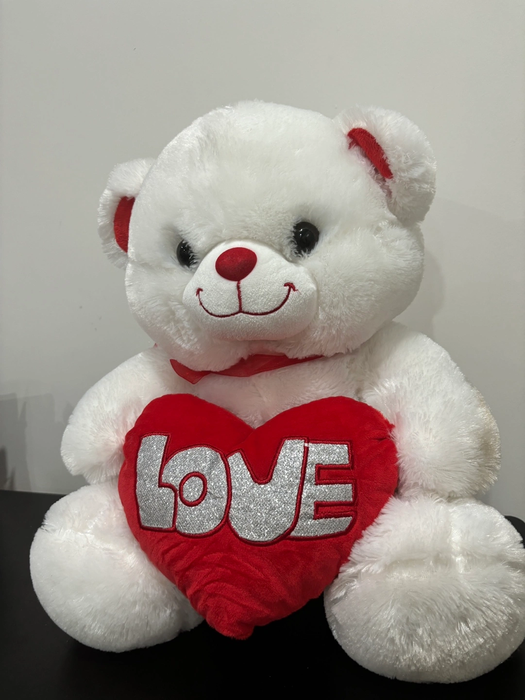 Large white plush teddy bear. Holding a red heart that says LOVE in silver glitter. Red ribbon around neck. Soft and cuddly.