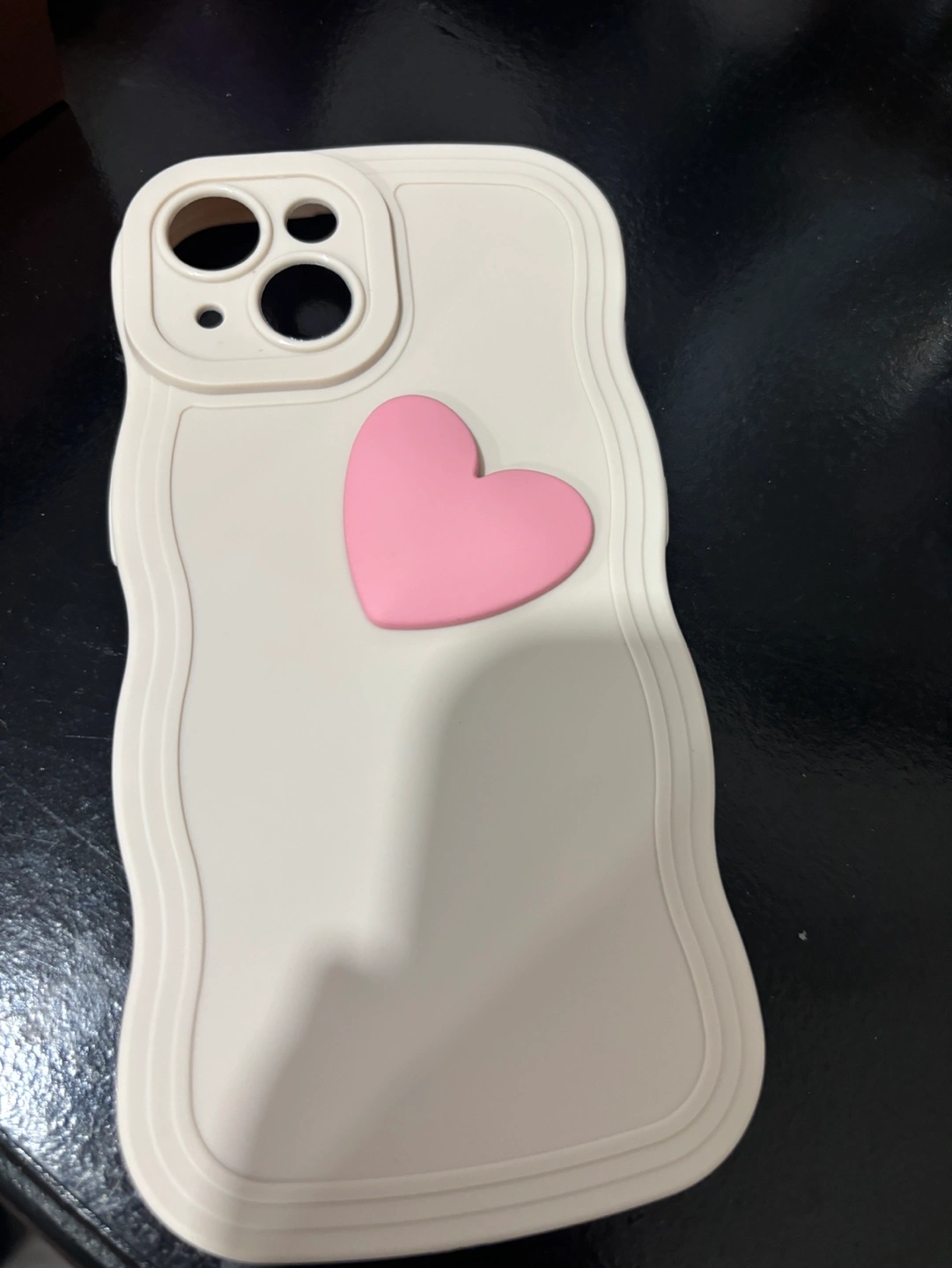 Off-white silicone phone case. Features a 3D pink heart. Compatible with iPhone 12 and 13 models.