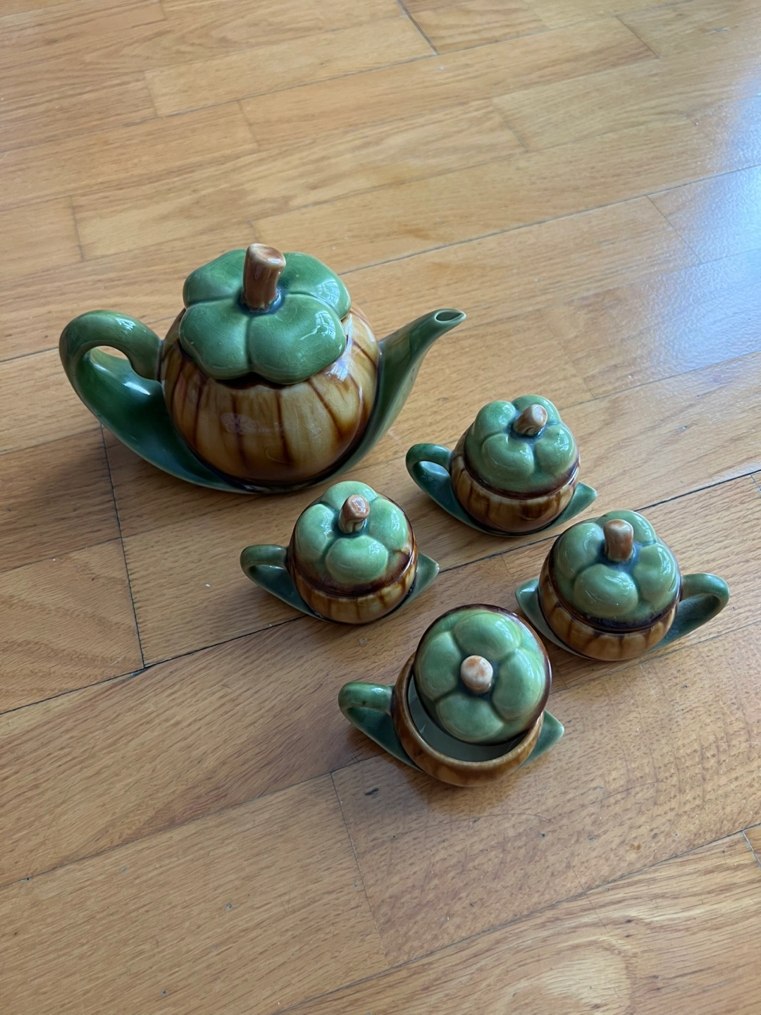 Adorable ceramic tea set. Features a teapot and four small cups. Mangosteen design. Green and brown glaze. Perfect for a unique addition to your collection.