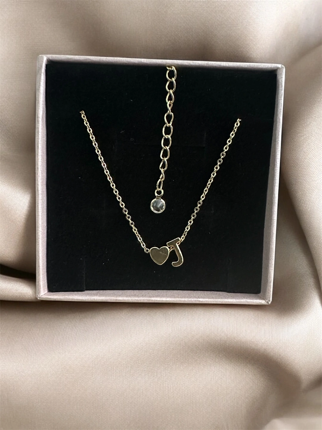 Dainty gold necklace. Features a small heart charm and initial J pendant. Comes in a gift box. Perfect gift.